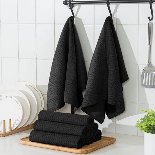 Waffle Weave Kitchen Towels and Dishcloths Set, 26 X 18 Inch and 12 X 12 Inch, Set of 10 Black Lint Free Dish Towels for Drying Dishes (Black, Kitchen Towel Set)