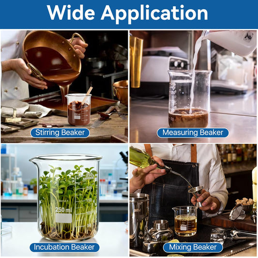 Worldity 6 Pack 250ml Glass Beakers, 3.3 Borosilicate Glass Beakers with 6 Bubble Wrap Protectors, Heat Resistant Low Form Graduated Measuring Cups for Cooking, Baking, Liquids, Home Experimenter