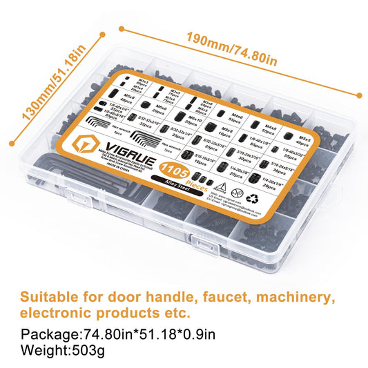 VIGRUE 1105PCS 25 Sizes Metric & SAE Set Screw Assortment Kit Internal Hex Drive Allen Grub Screws Set Cup-Point Alloy Steel, M3 to M8 and 1/8-40 to 5/16-18