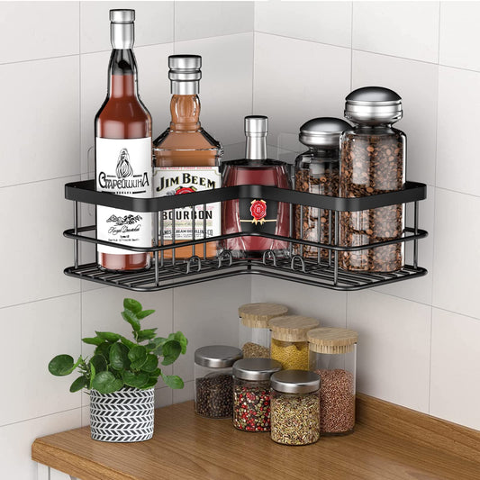 Yazoni Corner Shower Caddy, Adhesive Shower Shelves No Drilling [2-Pack], Rustproof Stainless Steel Bathroom Shower Organizer Wall Mounted with 8 Hooks (Black)