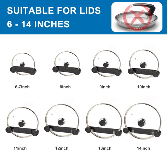 YONGAIJIA New Upgrade 4 Pack Adjustable Pot Lid Holder, Lid Organizer Fits 6" to 14" Lids, with Screw Hole Position and Sticky Wall Mounted Lid Storage Kitchen Cabinets, Cabinet Doors (Black)