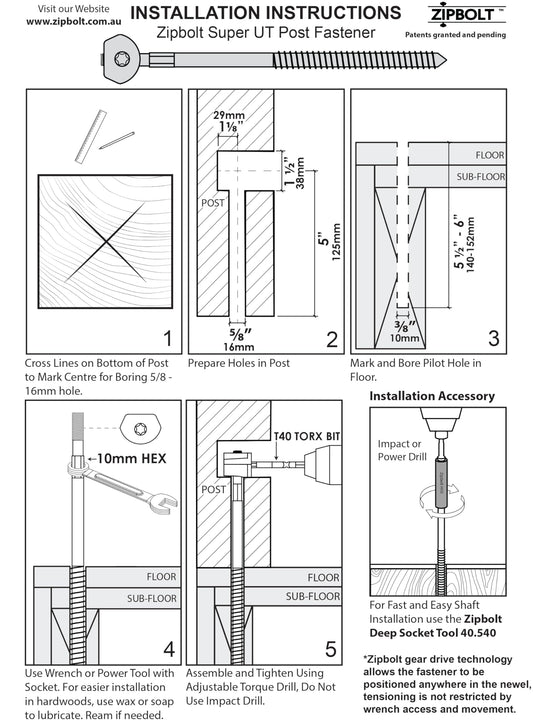 Zipbolt Super UT 14.110 Newel Post Fastener — Patented Gear-Drive Allows for Quick and Easy Wrench-Free Installation of Staircase Newel Posts, Heavy Duty Post Mounting Kit is Perfect for Residential and Commercial Use, New Construction and Remodels