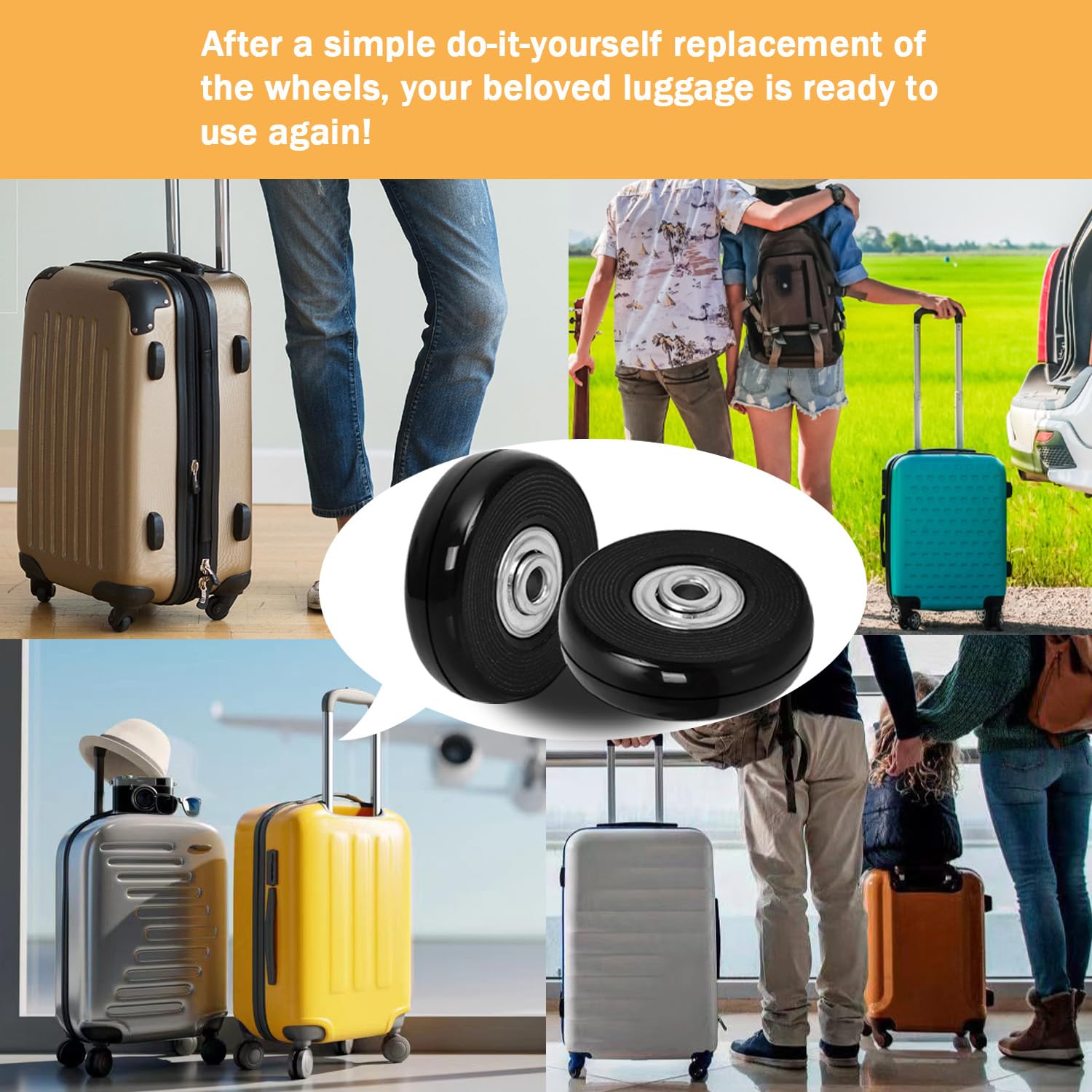 - ◉【MAKING IT ECONOMICAL】If you ask a professional to repair the wheel for your suitcase, you will have to buy a new one, which is often very expensive. Using our luggage spinner wheels replacement, you can easily replace it yourself.The suitcase wheels perfectly fit most luggage,please check the correct size of this replacement wheel before making the order.And these wheels roll over most materials - any flooring, sidewalk, asphalt - without issue.