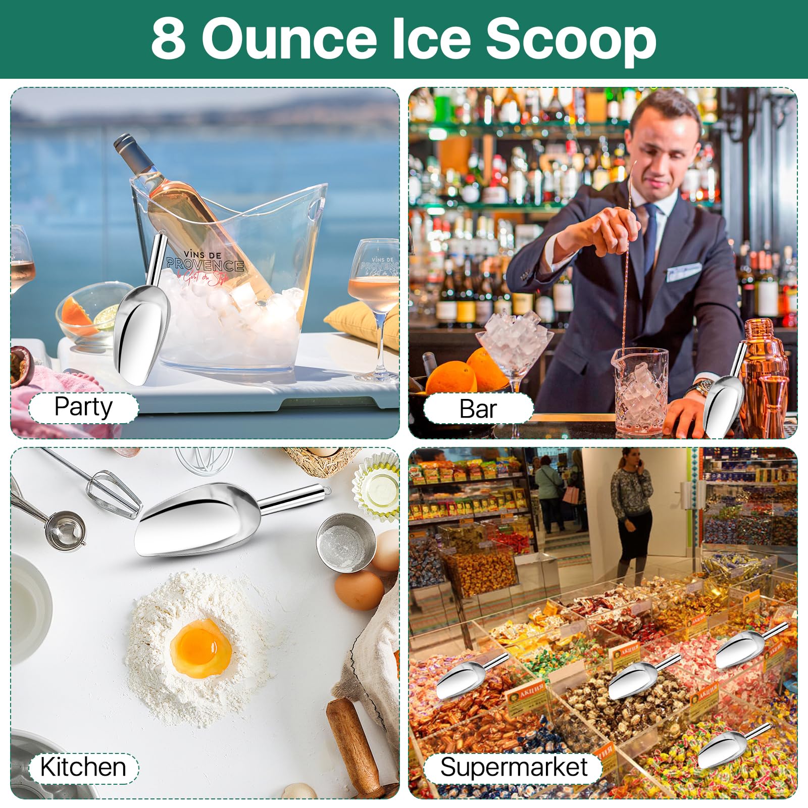 Akamino 8 Ounce Ice Scoop Set of 4, Stainless Steel Food Scoop for Kitchen Bar Party, Mirror Polished Metal Scoop Utility Scooper for Ice Cube,Coffee Bean,Candy, Cereal,Flour,Popcorn-Dishwasher Safe