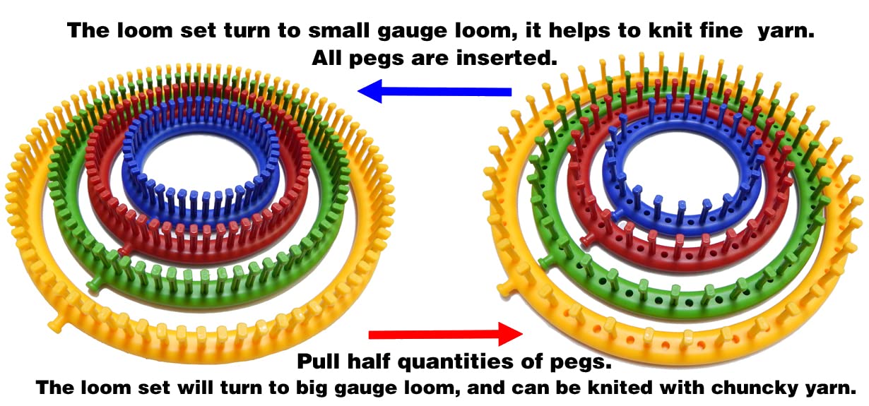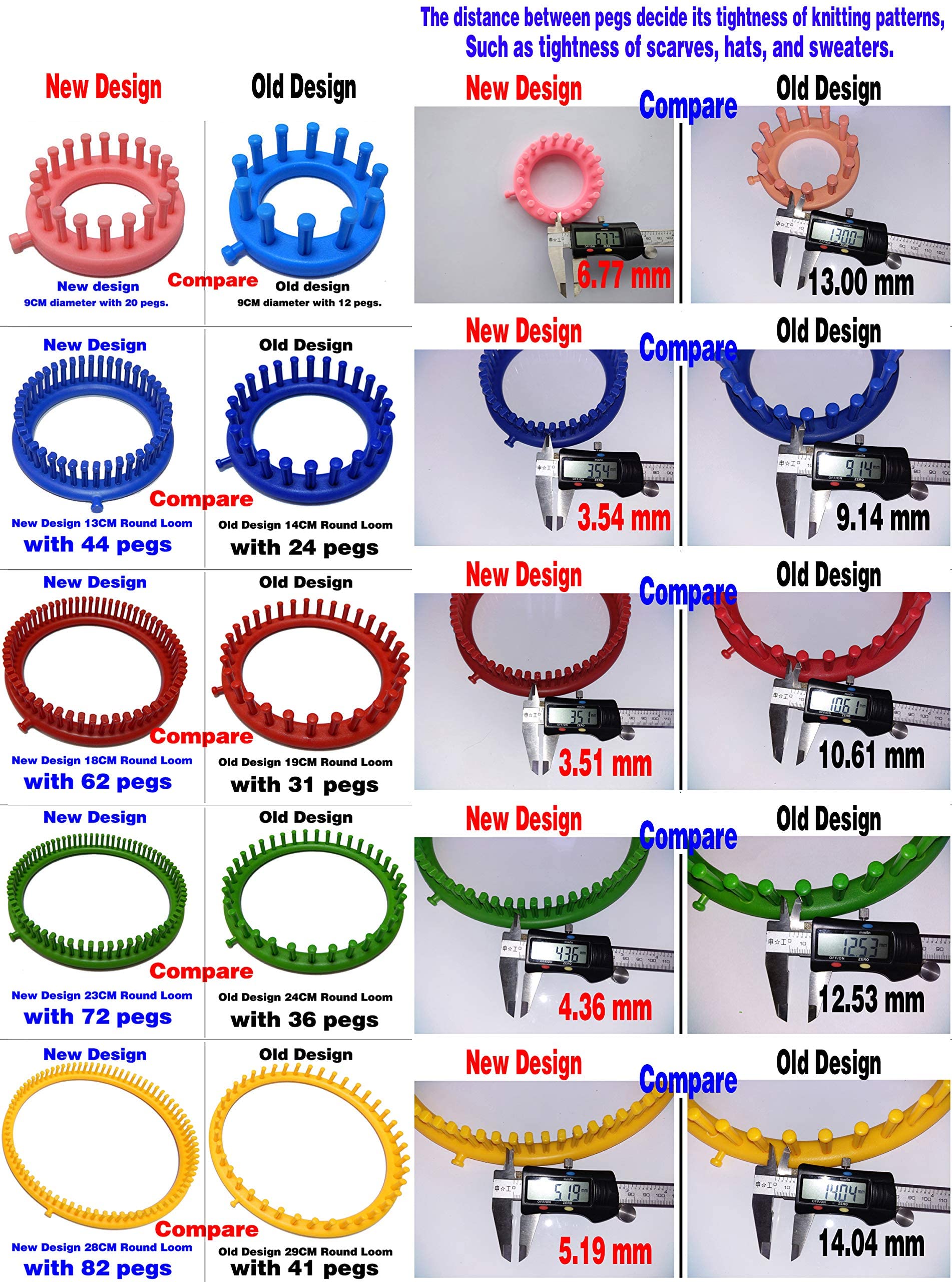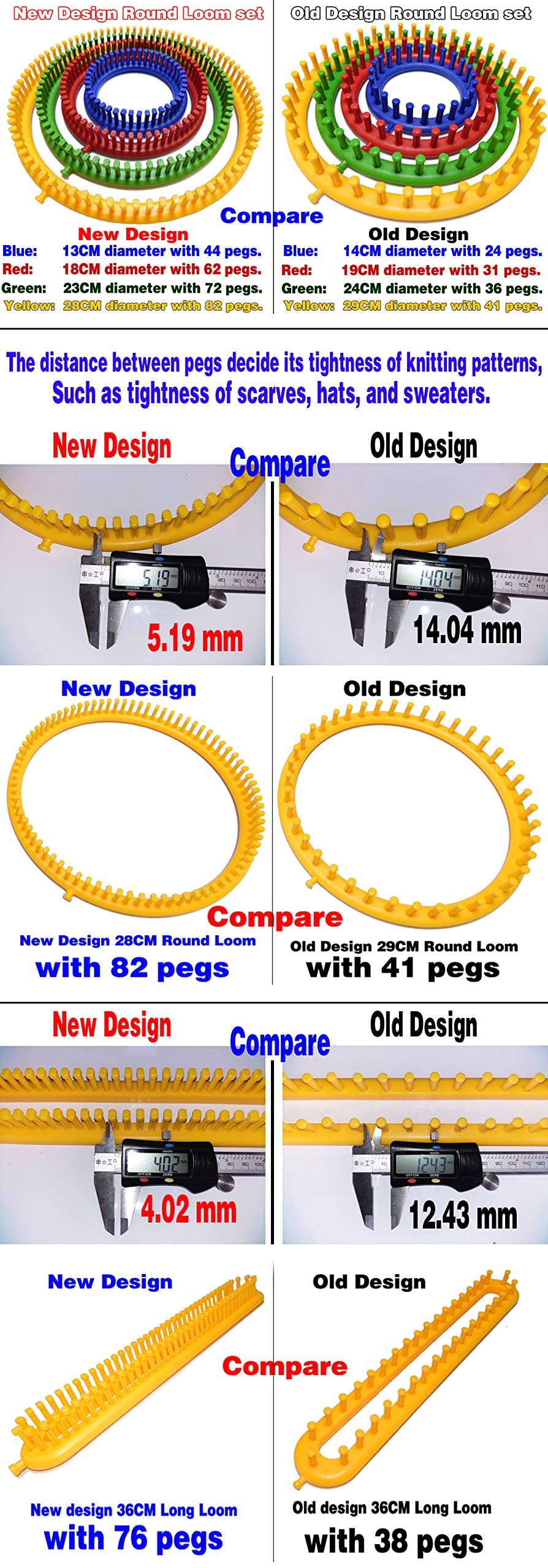 - 2. The quantities of New design looming pegs twice as many as that of those old design looms. More looming pegs help to knit both thick or thin yarns, More knitting projects.