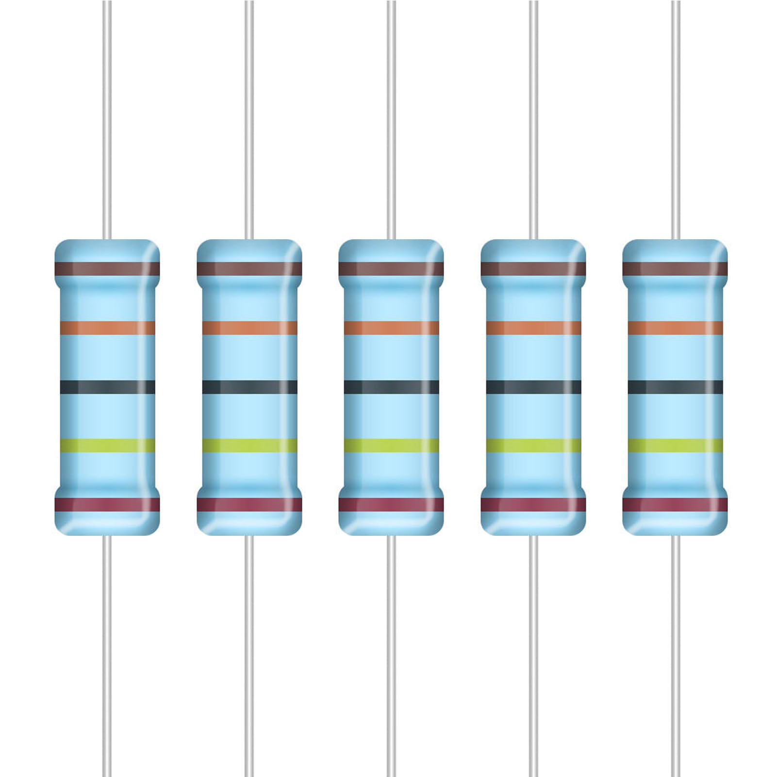 - 5W Metal Film Resistor : 1Ω, 2.2Ω, 3.3Ω, 10Ω, 22Ω, 47Ω, 68Ω, 100Ω, 120Ω, 150Ω, 220Ω, 330Ω, 470Ω, 560Ω, 680Ω, 1KΩ, 2KΩ, 2.2KΩ, 4.7KΩ, 5.6KΩ, 10KΩ, 22KΩ, 47KΩ, 100KΩ,1MΩ with ±1% tolerance range.