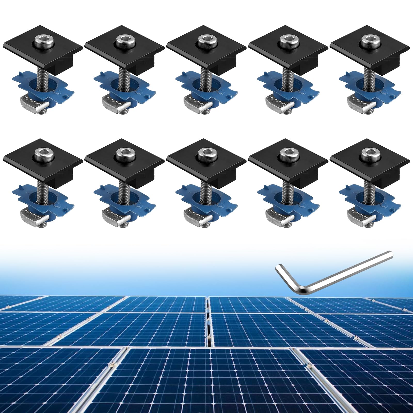 - Complete Mid Clamp Kit for Unistrut: 10 pieces solar panel center clip including mounting screws (M8*59 mm) and Channel Squeeze Nuts. Suitable for Unistrut and for 30mm/35mm thick solar panels
