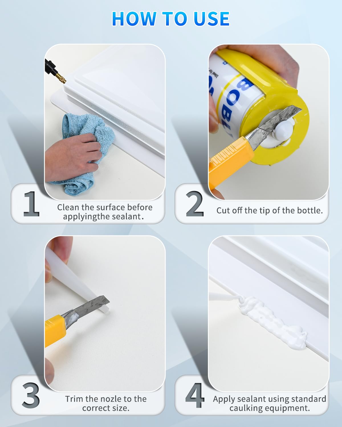- WIDE APPLICATION : Bonding with various surfaces, including EPDM, TPO, PVC, Aluminum, brass, steel, glass, mortar, wood, etc. RV self leveling roof sealant meets the different needs of the camper or trailer roof surfaces, or easily patches large cracks elsewhere in your RV.