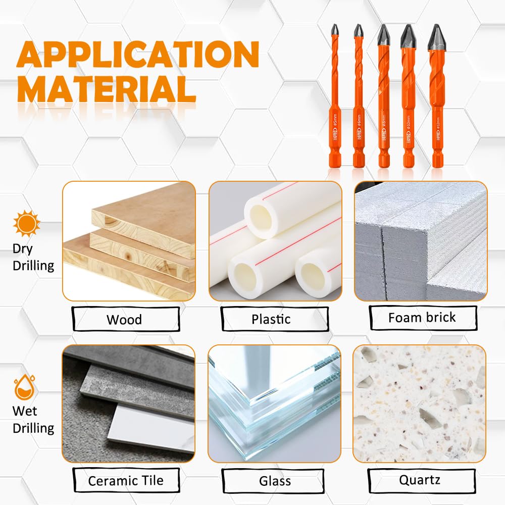 - 【✅Wide applicability】Eccentric drill kit can directly dry drill wood, plastic (PVC pipe), foam tiles, antique tiles, glazed tiles, red bricks, cement, concrete (need to avoid reinforcing steel) and other softer materials, add water to drill glass tiles, porcelain tiles, ceramics, marble, glass and other harder materials