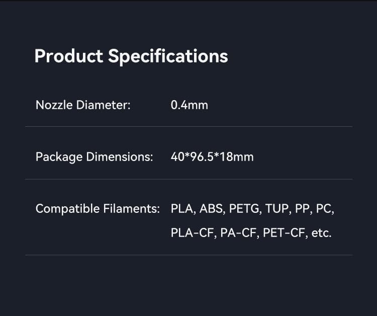The nozzle is composed of copper alloy and hardened steel, supporting the printing of various filaments such as PLA, ABS, PETG, TPU, PP, PC, PLA-CF, PA-CF, PET-CF