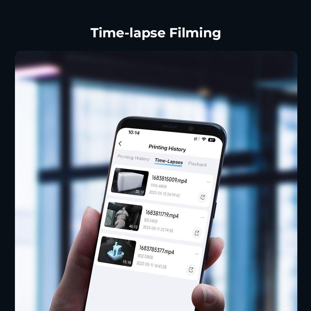 - Time-lapse Filming: Log in to Creality Cloud to automatically create time-lapses for sharing