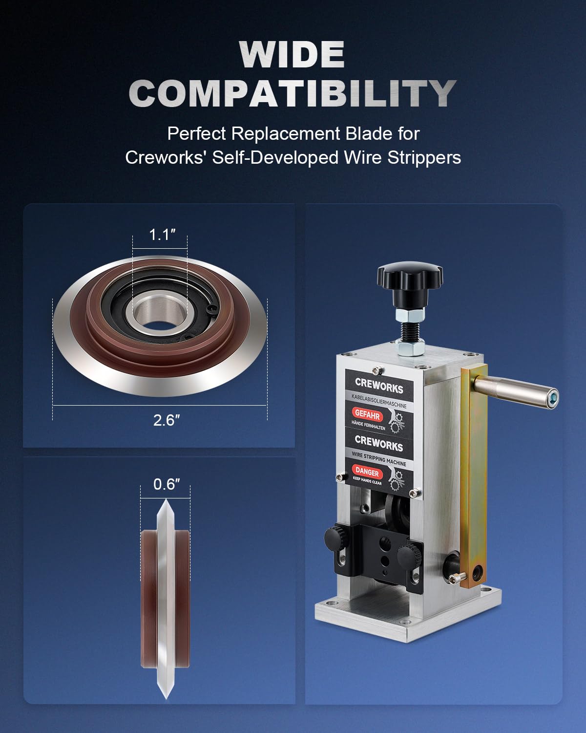 - Perfect Fit for Creworks Wire Strippers: This 0.6" thick blade is a direct replacement for Creworks cable strippers. With a 1.1" inner blade and 2.5" outer blade, it efficiently removes insulation from copper wires ranging from 0.06" to 1" (1.5-25 mm)
