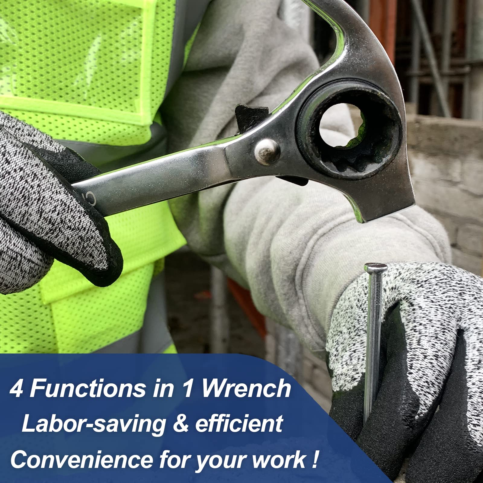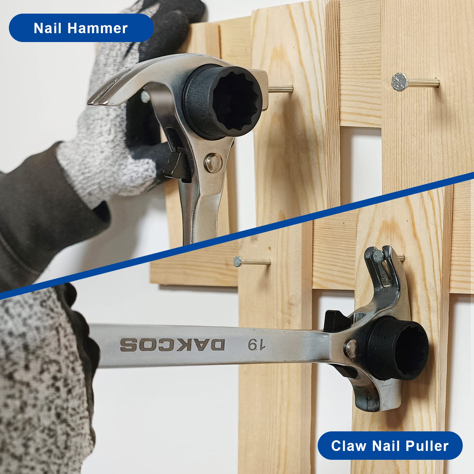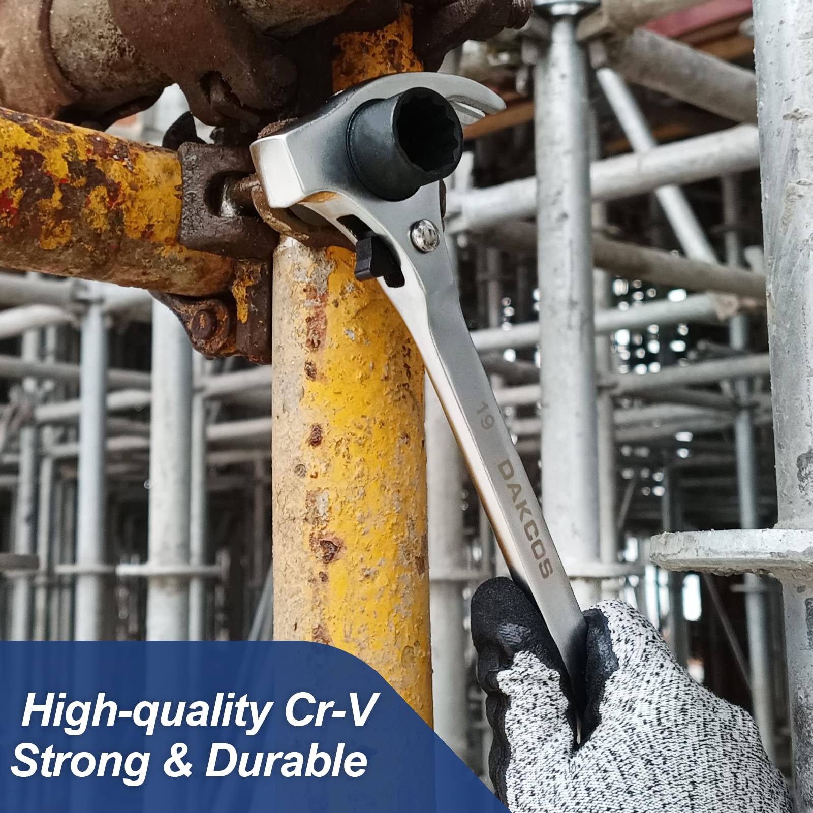 DAKCOS 4-in-1 Ratchet Podger Wrench, 19x22mm Multifunctional Scaffold Ratchet Spanner with Pry bar, Hammer & Claw Nail Puller (Silver)