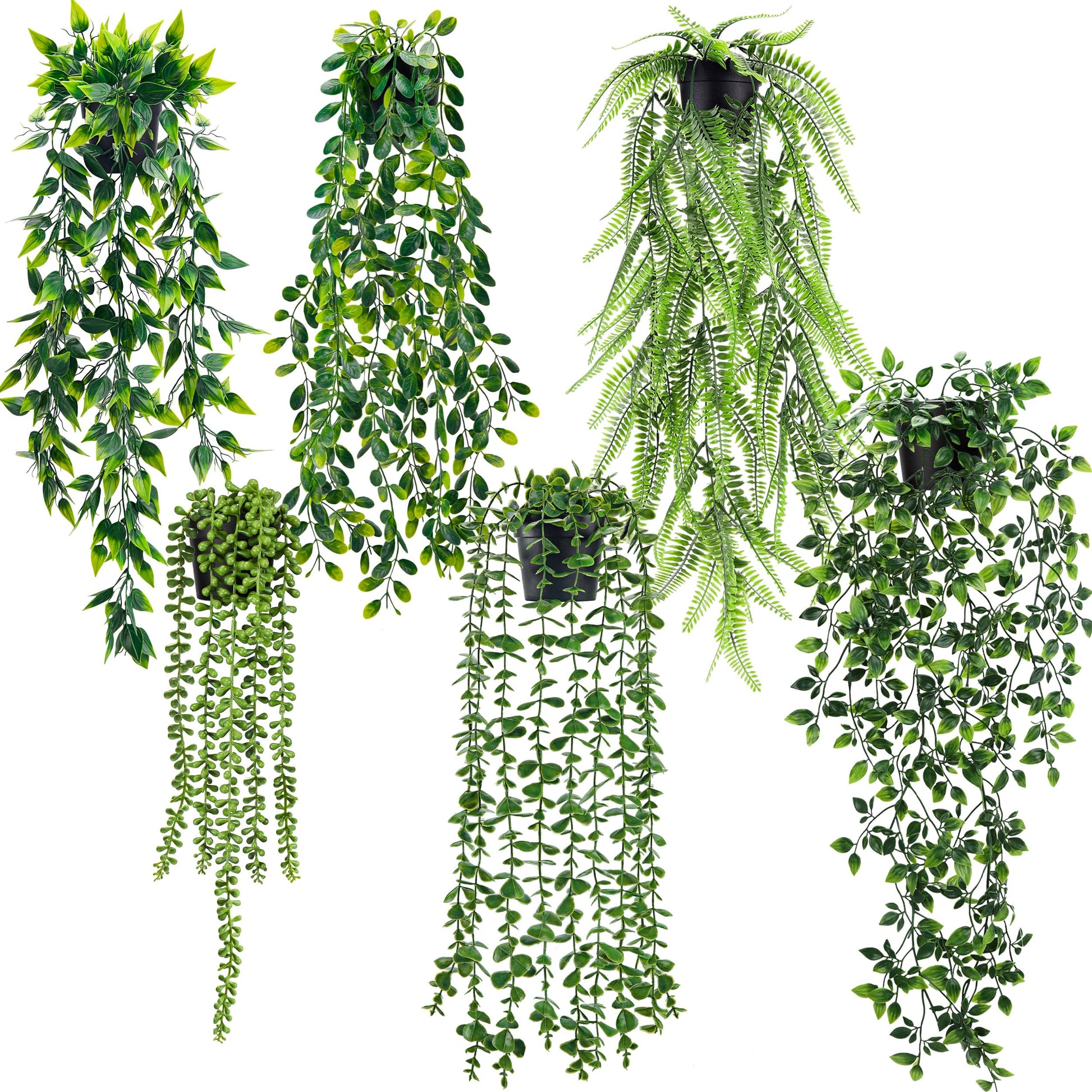 - 【Package Content】This set includes 6 packs of stylish artificial hanging plants in black pots. You’ll receive a curated mix of popular faux plants indoor such as eucalyptus vine, mandala vine, string of pearls, chicken heart leaf, locust vine, and Boston fern—ideal as bathroom wall decor or shelf decor