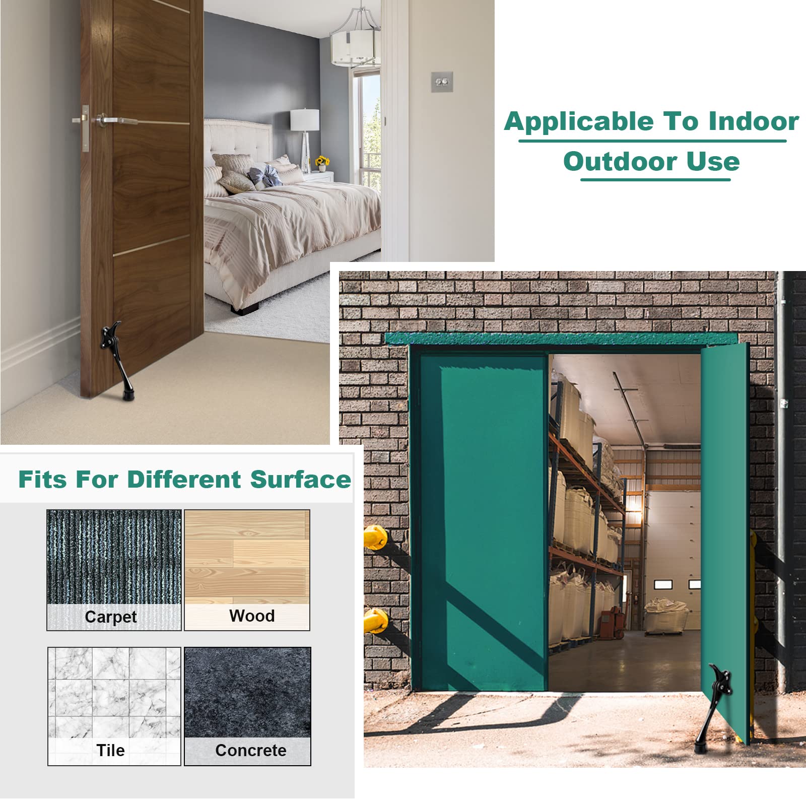- No Slip Rubber Tip – The metal door stopper with the upgraded strong grip rough tooth rubber tip, can effectively to stop the door and keep door open, avoid the annoying door slamming. Door prop can stick to all surfaces- such as hardwoods, concrete, tile, carpets.