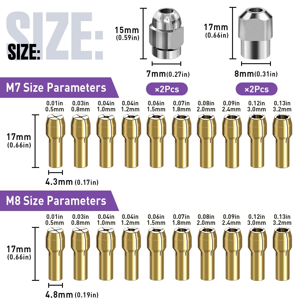 - Multiple Sizes Available: The set includes a variety of sizes of brass drill chucks, from 1/8" to 1/50" (0.5mm to 3.2mm) to meet the different needs of users and reduce the hassle of purchasing additional accessories.
