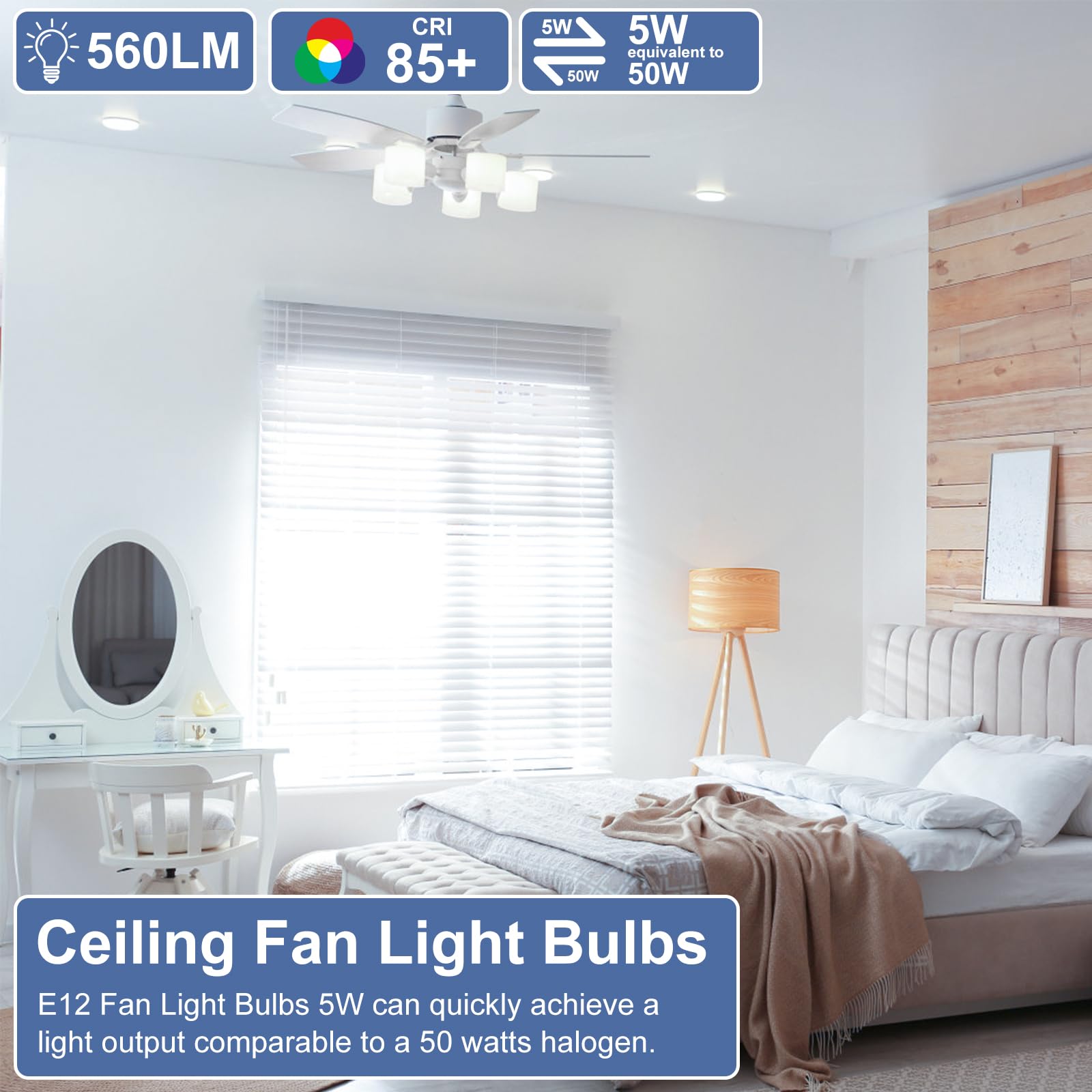 - 【E12 Base & Widely Used】Featuring a candle shape and a small screw base (E12, 12mm in diameter), easily replace ordinary E12 incandescent light. 270° beam angle,these ceiling fan light bulbs are widely used in chandeliers, pendants, wall sconces, and other decorative fixtures.