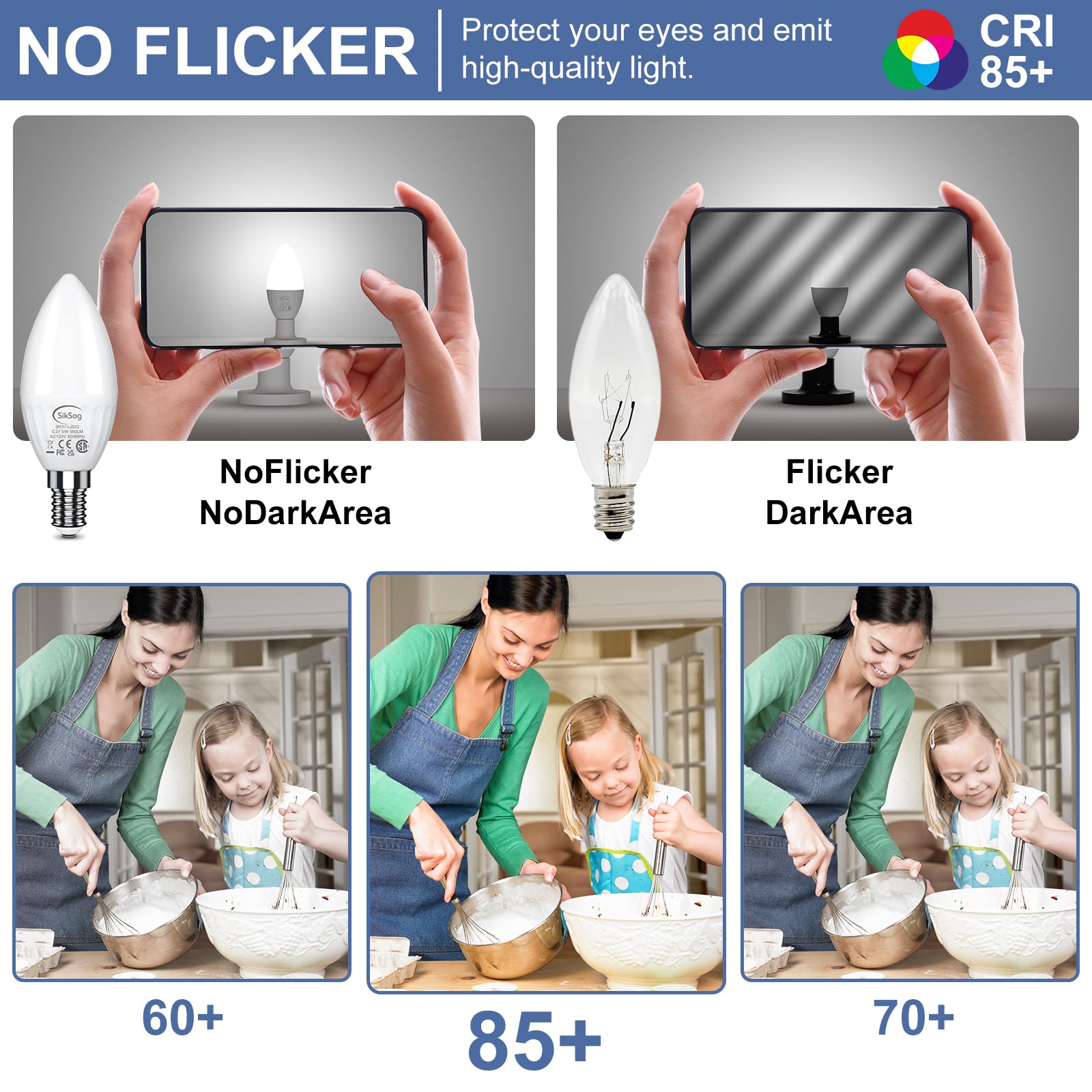 - 【CRI 85+ & Flicker-Free】85+ high color rendering indexes of this e12 candle light bulb provides vivid and true color. Instant on with full brightness. No flicker, no strobe, protect family's eyesight.
