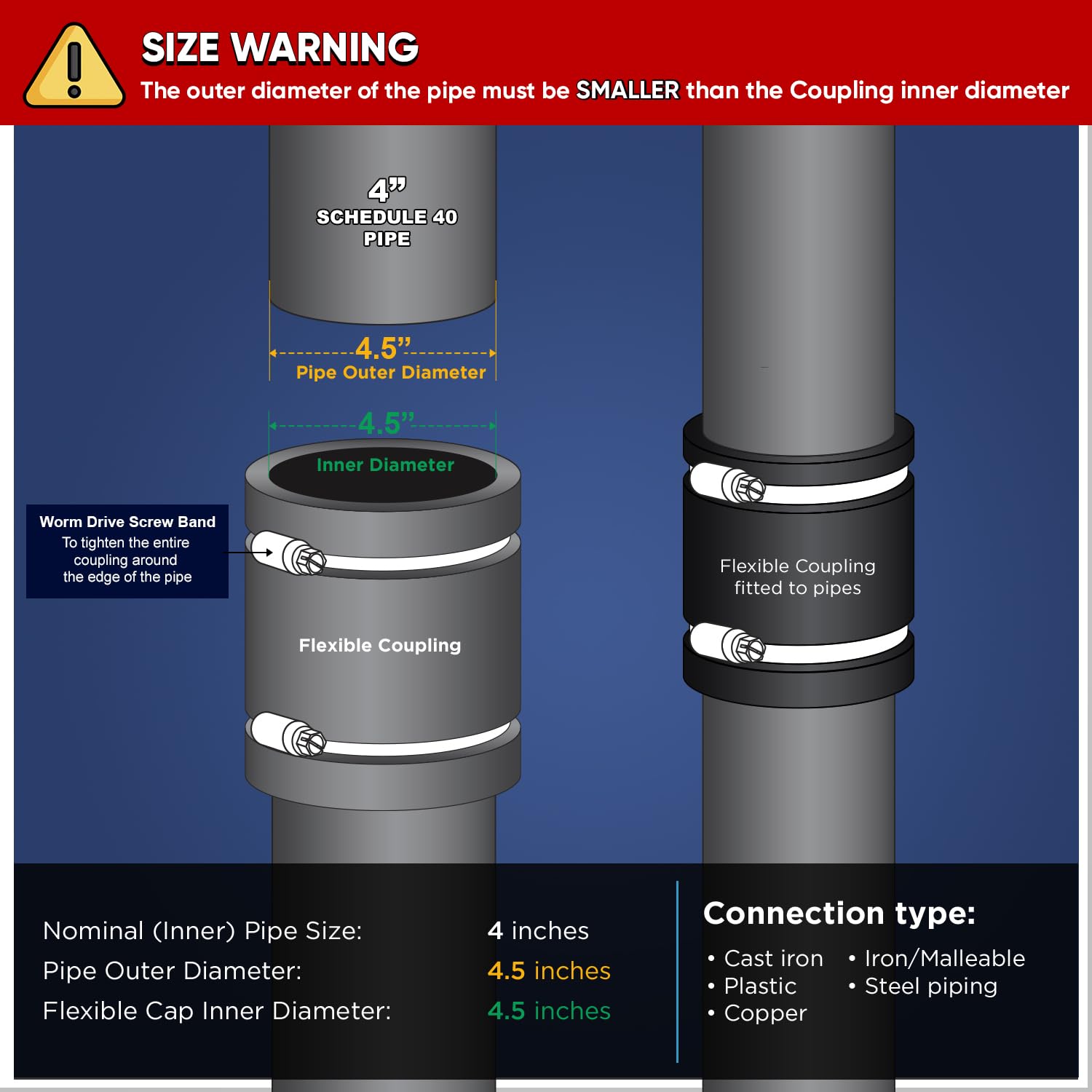 - Flexible Coupling Compatible with cast iron, , copper, lead, and steel piping
