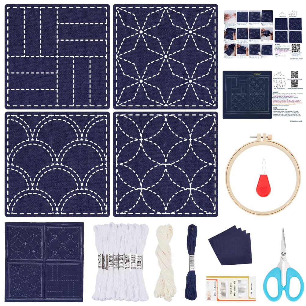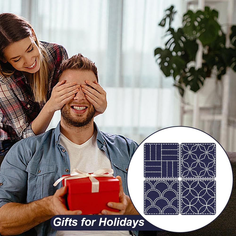 - Complete Sashiko Coasters Kit: Package includes a12*12'' cotton pre-printed cloth for you to make 4 sashiko coasters, embroidery needles*16pcs, white embroidery flosses. Each coaster measures about 5*5''.