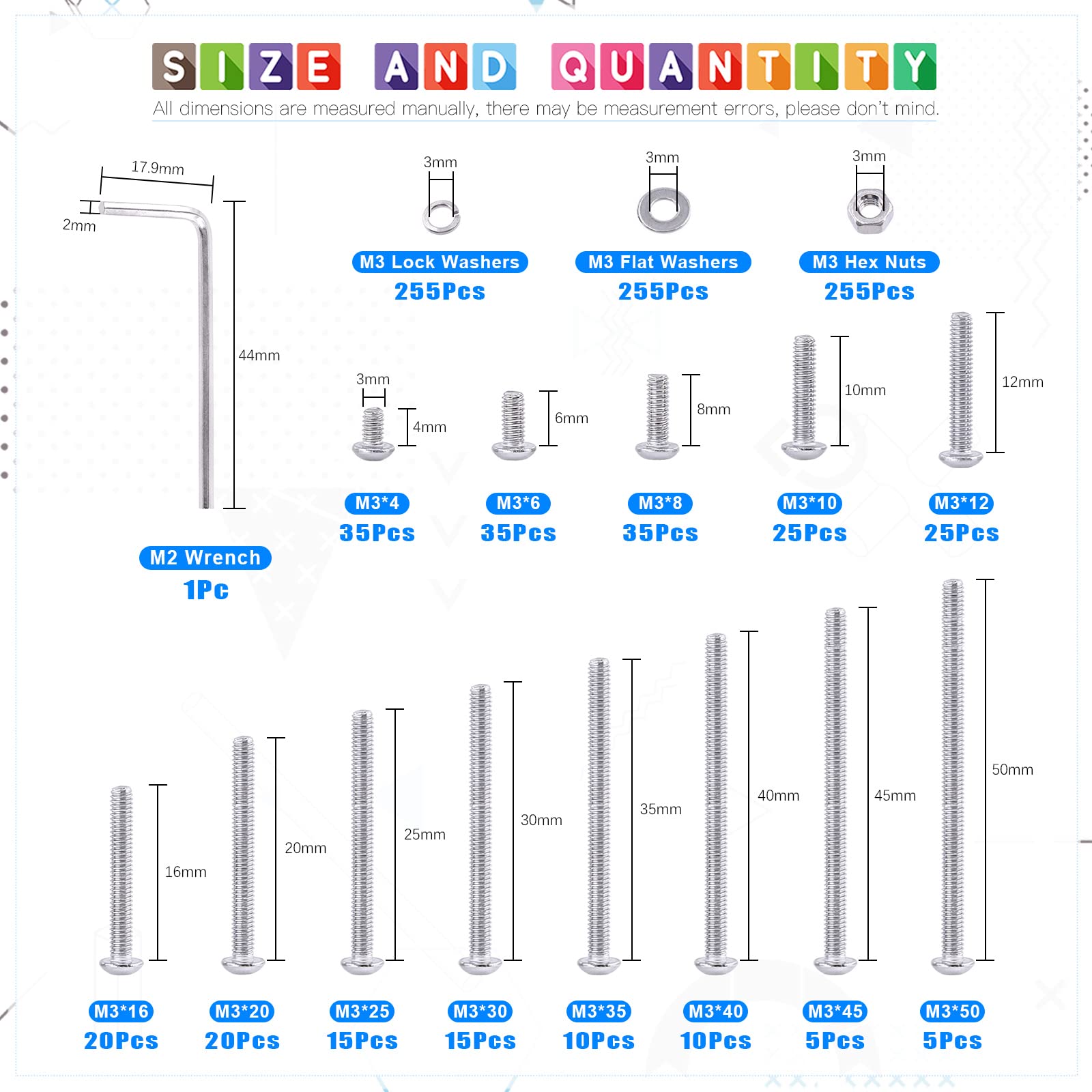 - ♛【Product Sizes】: There are 13 sizes of button head socket cap screws, the diameter is M3, which are M3 x 4mm/6mm/8mm/10mm/12mm/16mm/20mm/25mm/30mm/35mm/40mm/45mm/50mm. Comes with matching M3 hex nuts, M3 flat washers and M3 lock washers; the hex wrench size is M2. You can choose different sizes of screws according to various occasions.