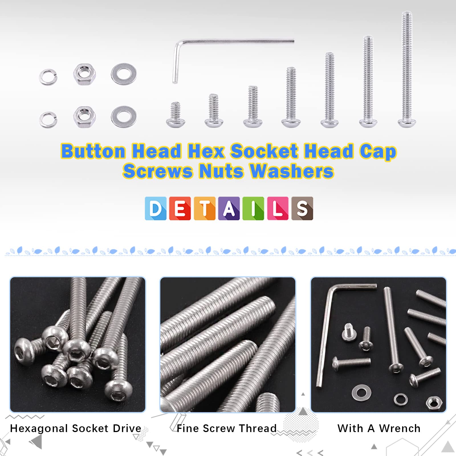 Details: Glarks 1021Pcs M3 Button Head Screws 304 Stainless Steel Hex Socket Cap Screws Bolts and Nuts Washers Assortment Kit with Hex Wrench for Machinery Furniture Car Repair