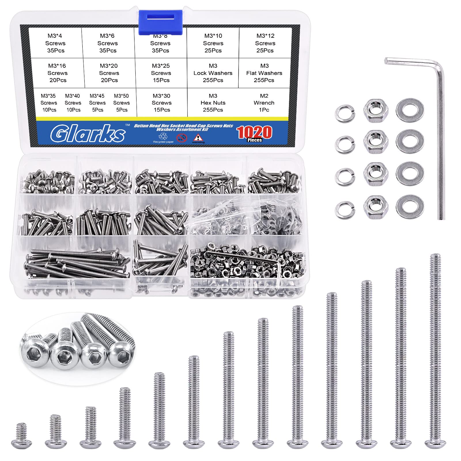 - ♛【Package Includes】: Glarks 1021pcs M3 button head hex screws kit includes 255pcs button head hex socket cap screws, 255pcs hex nuts, 255pcs flat washers and 255pcs lock washers. Come with 1pc hex wrench for easy installation. All of these screws, nuts and washers will be packed in a plastic box by type and size avoiding mess.