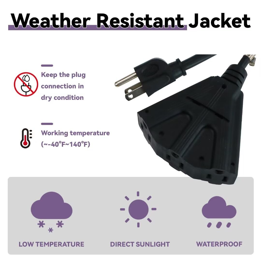 GREATIDE 25 Ft Outdoor Extension Cord with 3 Electrical Power Outlets - 16/3 SJTW Black Cable with 3 Prong Grounded Plug