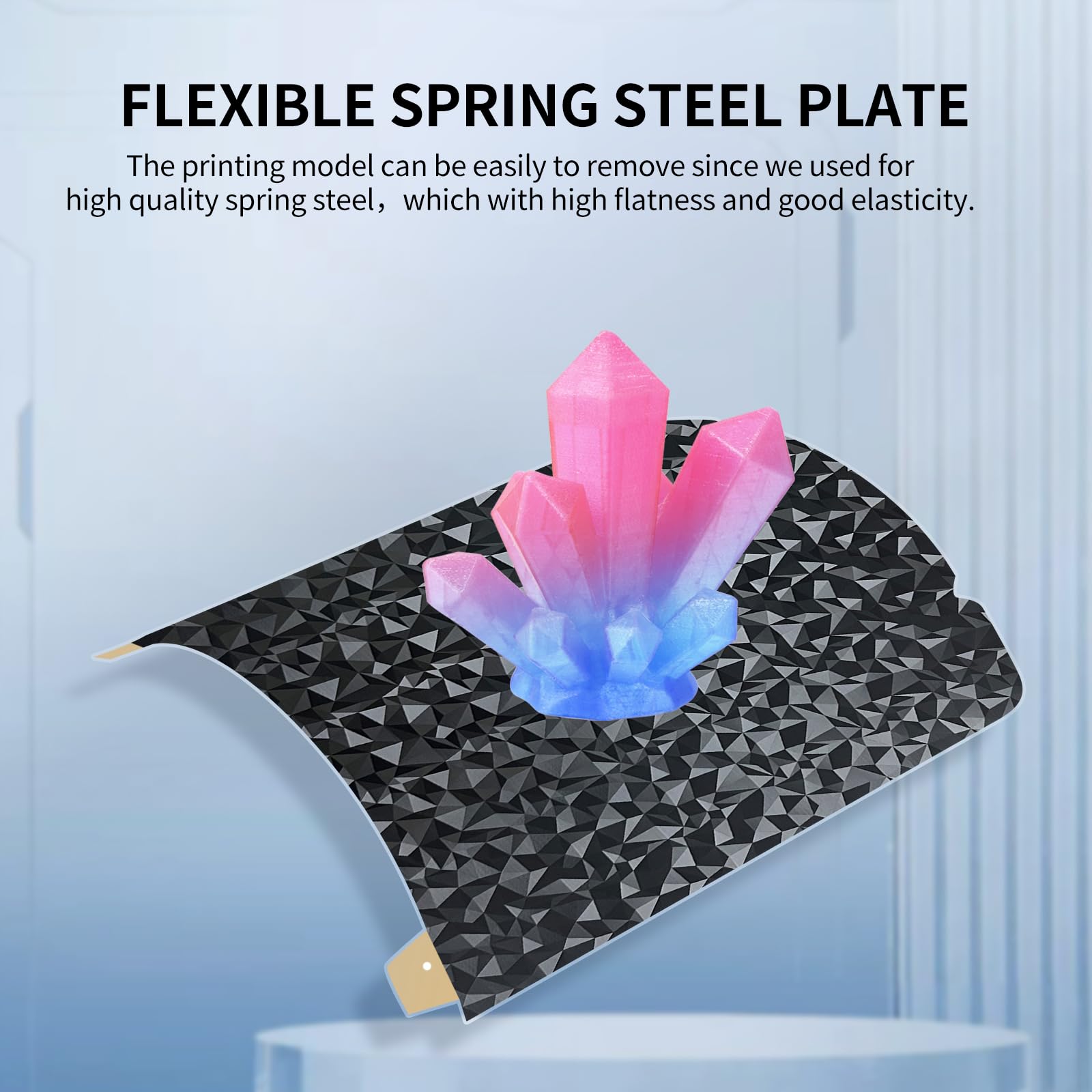 - 【Easy Model Removal】The spring steel plate not only has high flatness but also has good elasticity, it is not deformed after repeated bending, and removing your prints is a breeze. Simply lift it from the bed, bend it gently, and your model pops right off. When released, the sheet springs back to shape without breaking. Say goodbye to scratching, prying, or damaging your prints!
