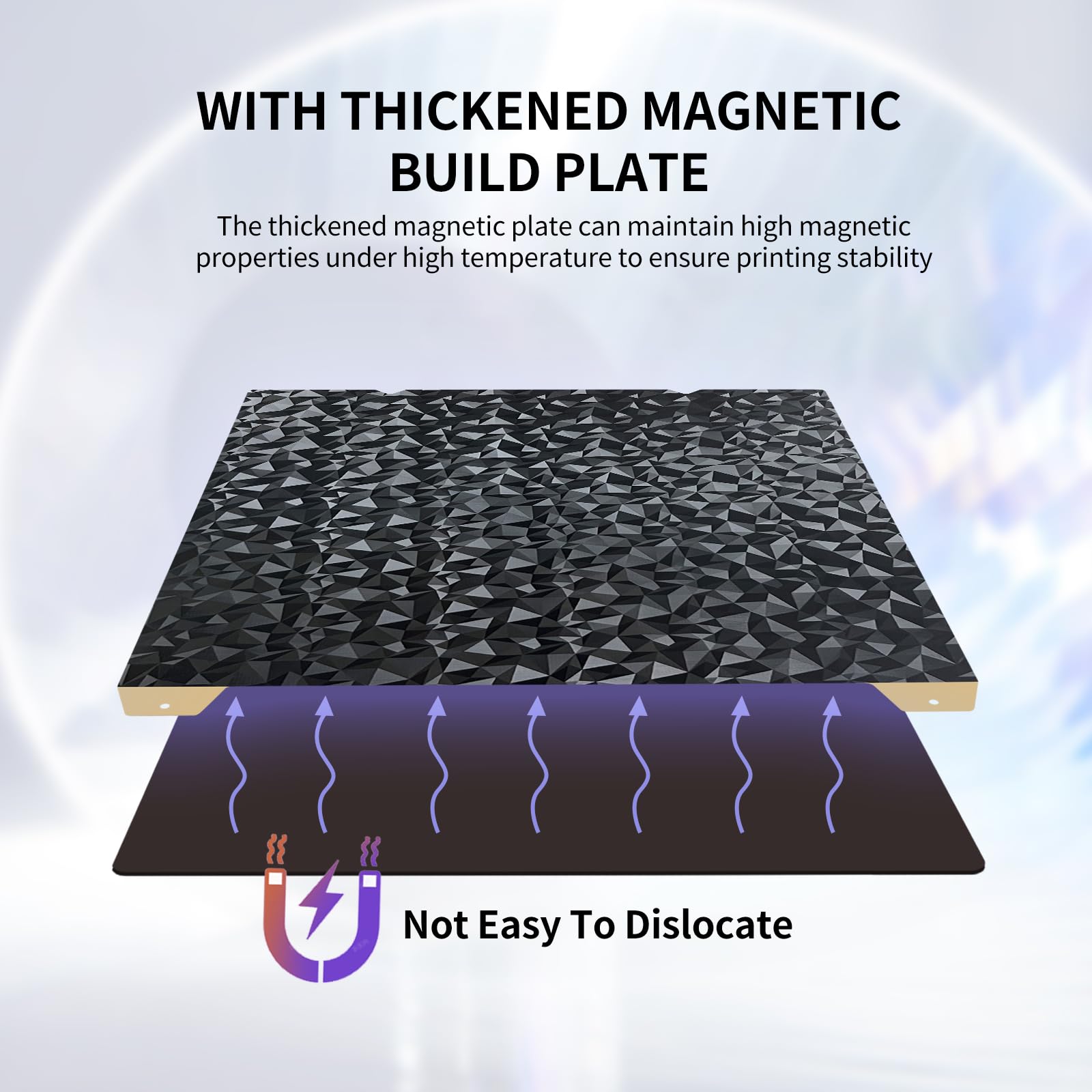 - 【Upgraded build plate】Double-sided PEO+PEI spring steel plate .One side is upgraded PEO film.PEO looks like countless diamonds on the surface, which makes your eyes light up. The other side is texture PEI. It is like fine sand on a golden beach, very durable and resistant to high temperatures. One build plate has two beautiful patterns. The bottom of the prints will leave a unique pattern.