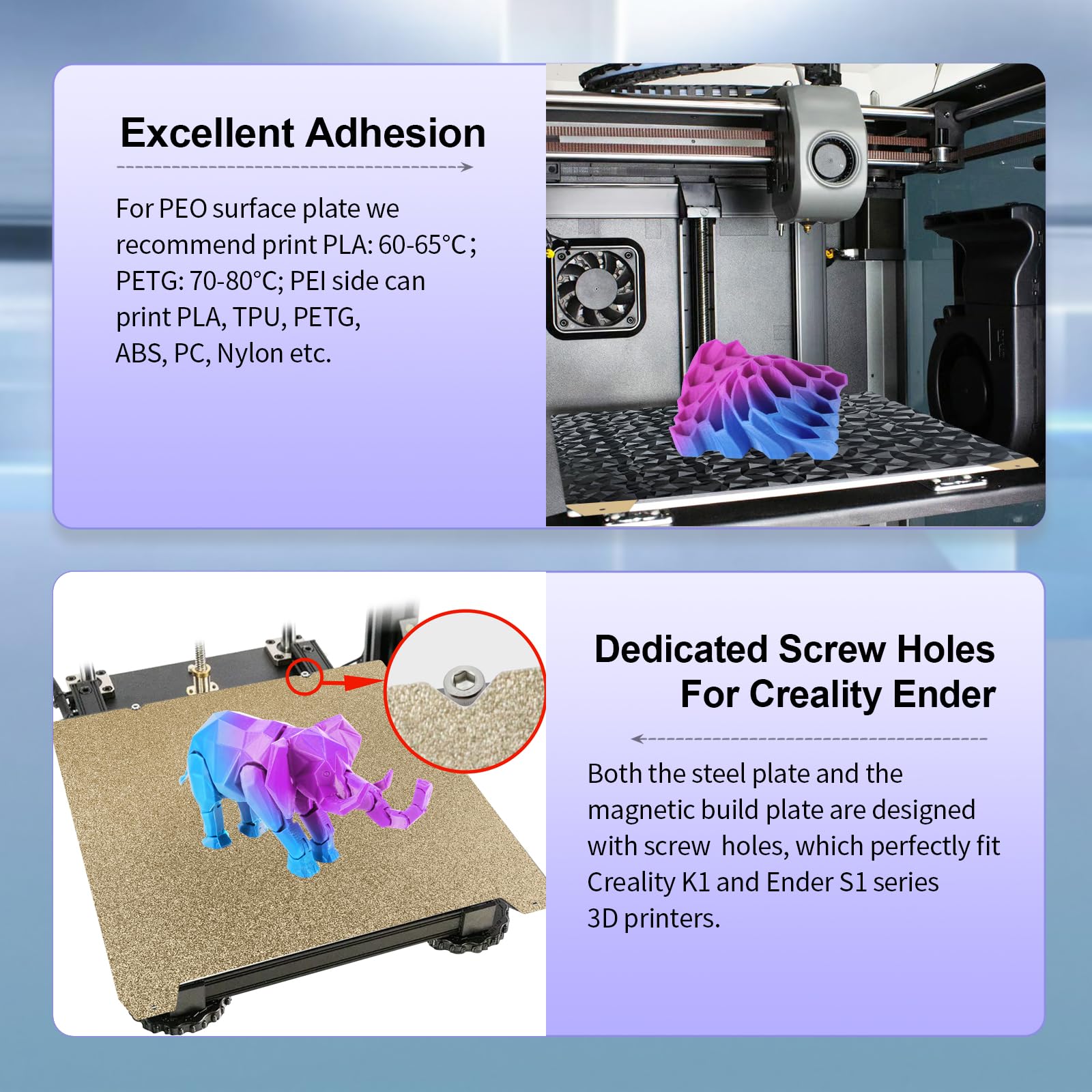 - 【Compatible Filaments】The PEO print bed surface is resistant to high temperatures 120°C and the textured PEI coating bed is 260℃, After our extensive testing, we recommend PEO to print PLA / TPU /PETG, If you want to print other filaments, please adjust the parameters. It is good to print PLA, PETG, ABS, TPU, ASA, PVA, PET, PA, PC, etc on the PEI surface.