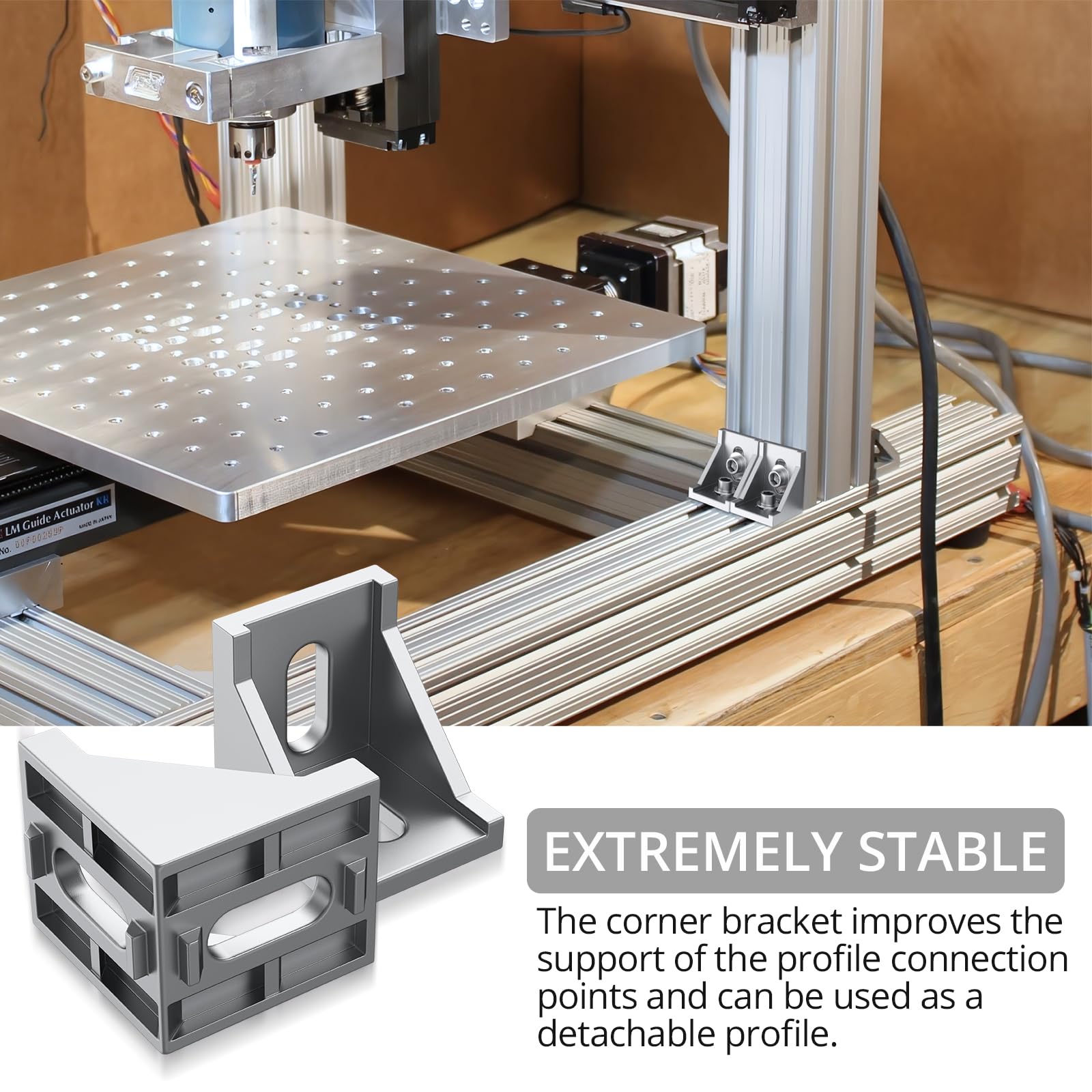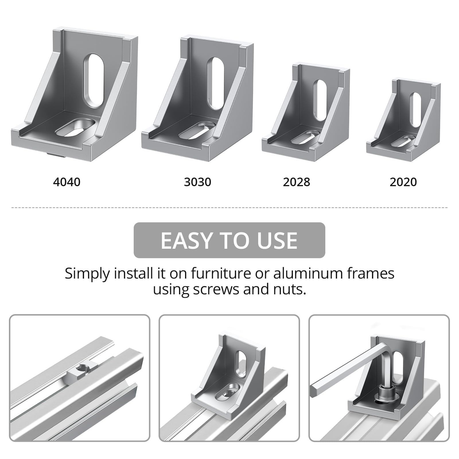 - Convenient Right Angle: The solid cast aluminum corner bracket features a right angle design, offering stability and strength to your connections. Come with 10 aluminum connectors, 20 screws, 20 T-sliding nuts, 1 hex wrench. Easy to assemble and use