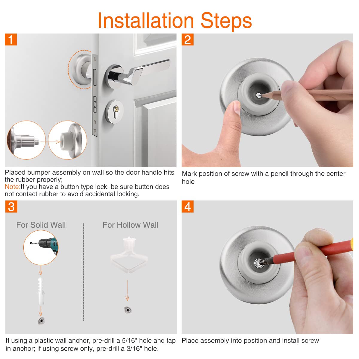 - EASY INSTALL & NEVER FALLING OFF - Our door knob wall protector come with the necessary parts for installation, installation won't take more than 3 minutes. Wall stopper is fixed to the wall by screws firmly, so you will never worry about it falling off.