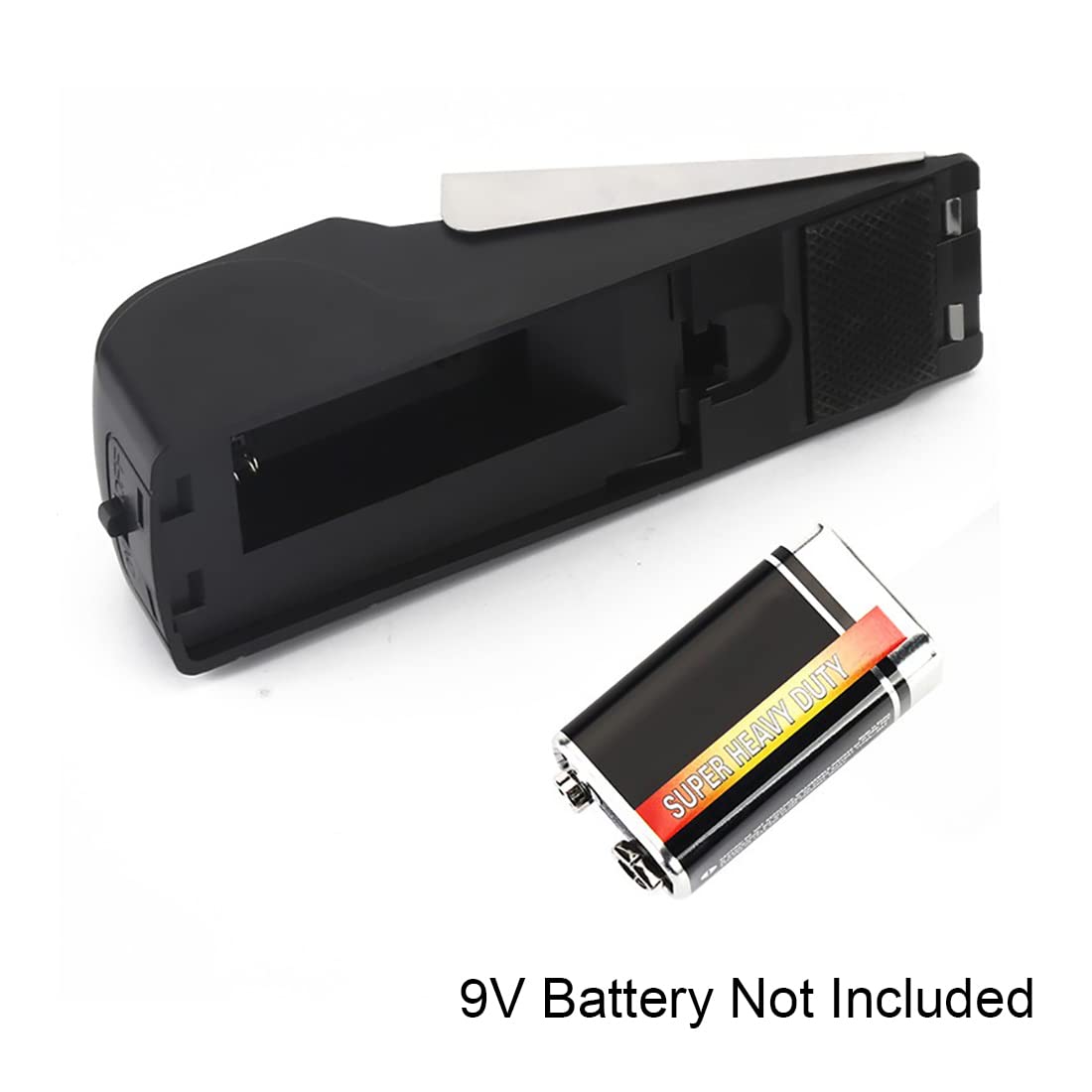 - Easy Operation: 1) Put one 9V battery; 2) Select sensitivity level: M(meddle), L(Low), H(High); 3) Turn ON alarm; 4) Insert alarm under door.