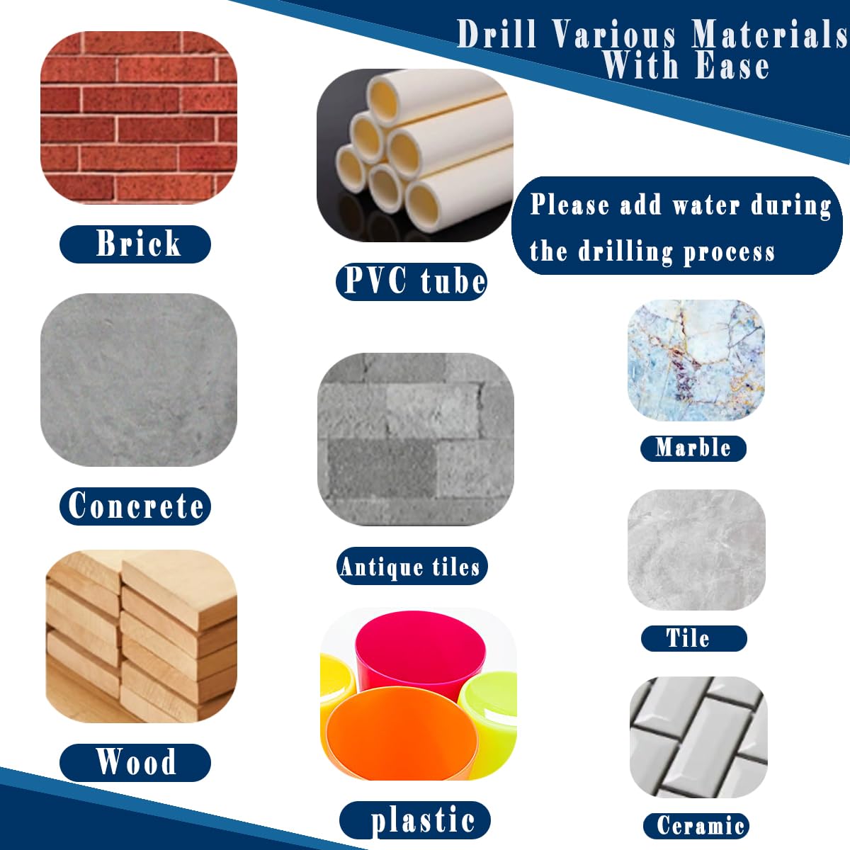 - 【Professional Drill Bits For a Wide Range Of Uses】 glass, ceramic tile, marble, metal, ceramic, stone wood, plastic, red brick wall, cement, PVC pipe, foam brick (can be drilled directly without adding water) can also be drilled with water according to the actual situation to prolong the life of the drill bit.