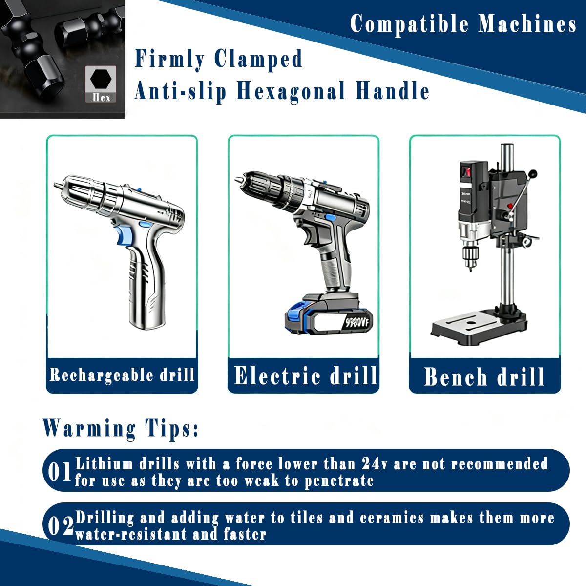 - 【Good Performance】Quick-fit hex shank design for stable clamping, smooth and easy drilling, fast and smooth cutting, be more efficient and durable. Compatible with most popular electric drills, angle grinders and bench drills, do not use impact or hammer mode. Generally hand drill in 2000-5000RPM, the faster the better, the slower then the shorter life span.