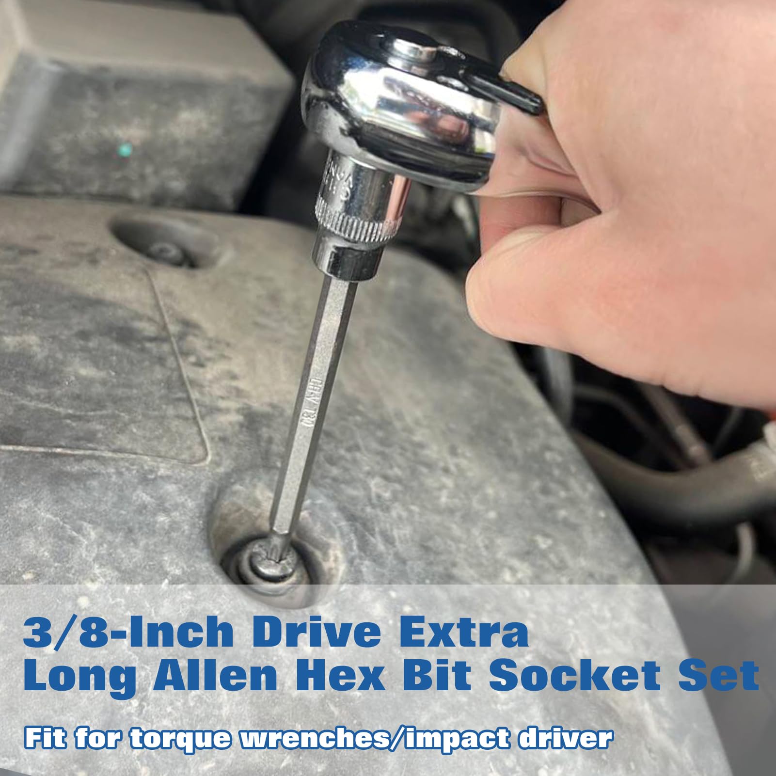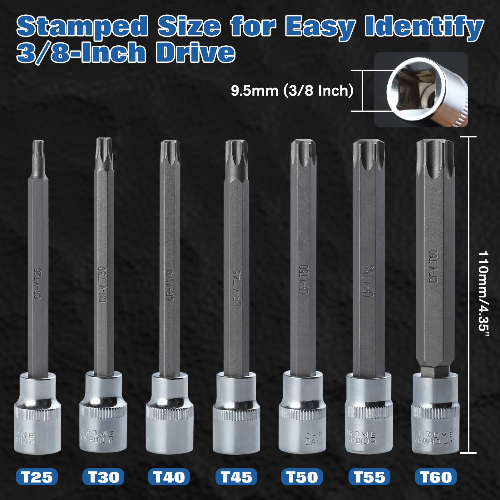 - Muti-size: The 3/8" Drive extra long torx star bit socket set provides 7 sizes on torx head: T25, T30, T40, T45, T50, T55, T60. 110mm length of the socket ensures easier and more flexible operation in the hard-to-reach spot.