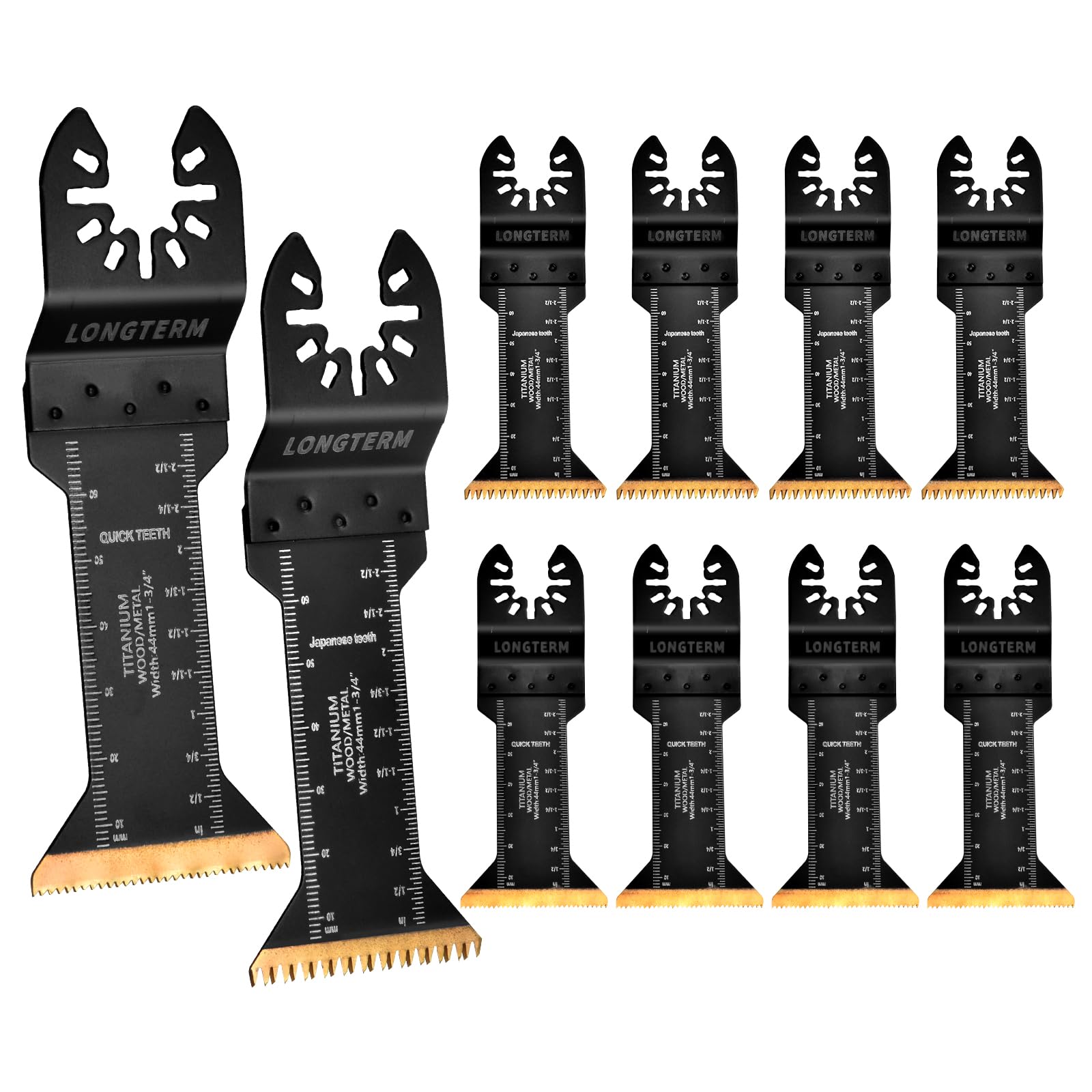LONGTERM 10PCS Bi-Metal Titanium-Coated Oscillating Saw Blades Multi Tool Blades Set for Wood/Metal/PVC Cutting, Quick Release Durable Blades Compatible with DeWalt, Makita, Ryobi