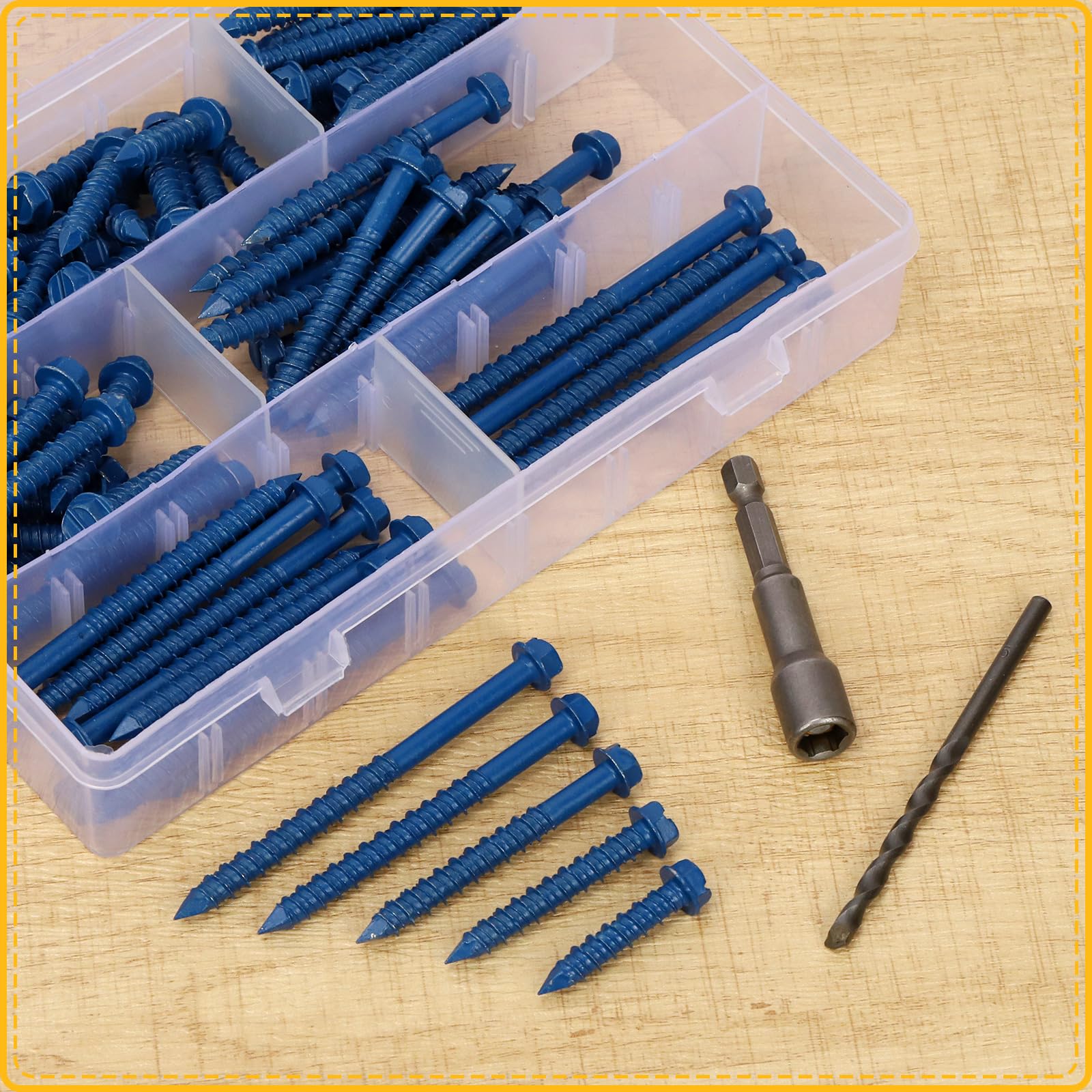 - 1️⃣What You Get: You will get 102pcs 5 sizes concrete screws anchor kit, including 40pcs 1/4"x1-1/4" concrete screws, 30pcs 1/4"x1-3/4" concrete screws, 15pcs 1/4"x2-1/4" concrete screws, 10pcs 1/4"x2-3/4" concrete screws, 5pcs 1/4"x3-1/4" concrete screws, 1pcs drill bit, 1pcs hex bit socket, all items are packed in a plastic box.