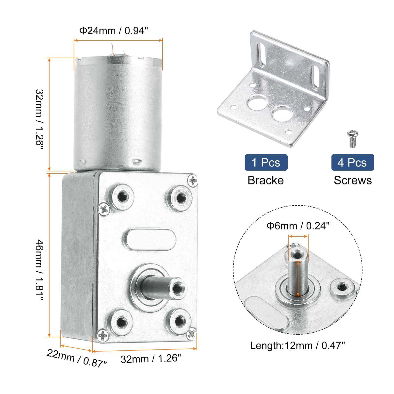 Package Content: 1 Pack x Worm Geared Motor, 1 x Bracket, 4x Screws