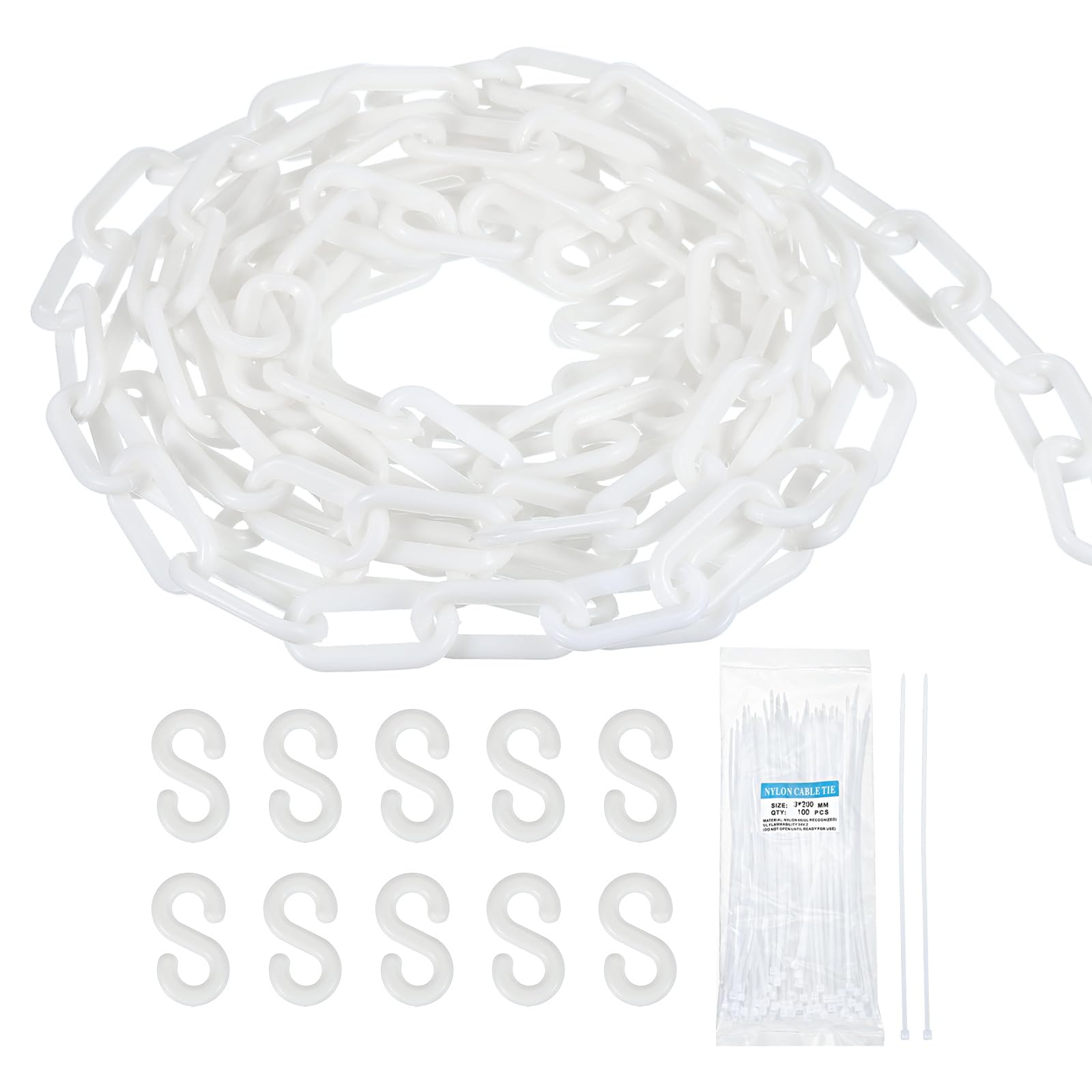 MECCANIXITY Plastic Chain 50 FT/15.5 M, Safety Chain White Plastic Chain Link Barrier with Zip Ties and S-Hooks for Crowd Control Queue Line Fence Decoration