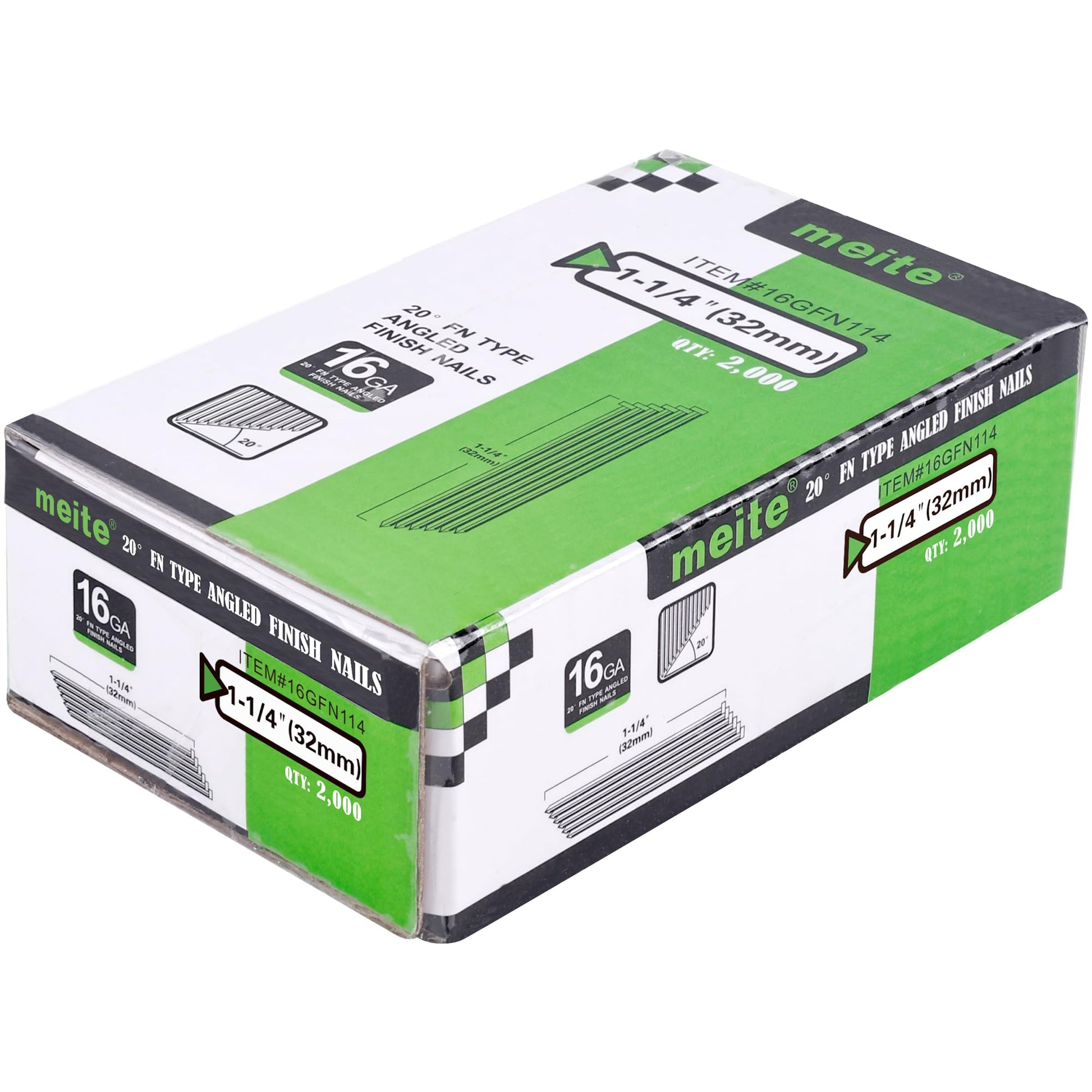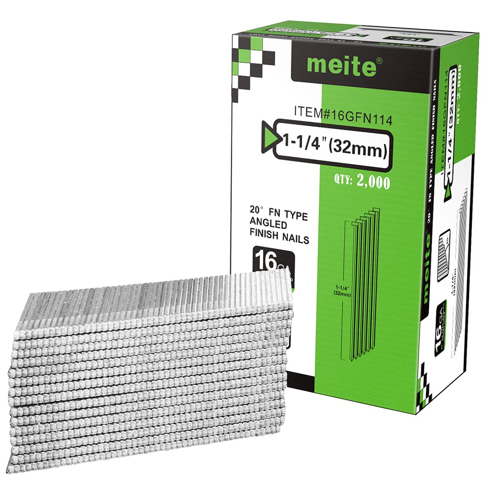 meite 16 Gauge Angled Finish Nails 1-1/4-Inch 32MM 20-Degree Galvanized Finishing Nails for Electric/Pneumatic Nailer Guns - Perfect for Window Trim, Cabinet Building and DIY Projects (2,000 PCS)