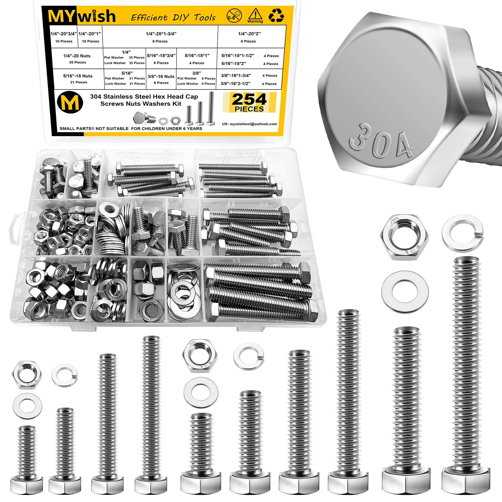 Mywish 254Pcs Bolts and Nuts Assortment, 1/4 20, 5/16 18, 3/8 16 Bolt, Heavy Duty 304 Stainless Steel Bolts and Nuts Kit with Flat Spring Washers, Includes 10 Common Sizes, Fully Threaded