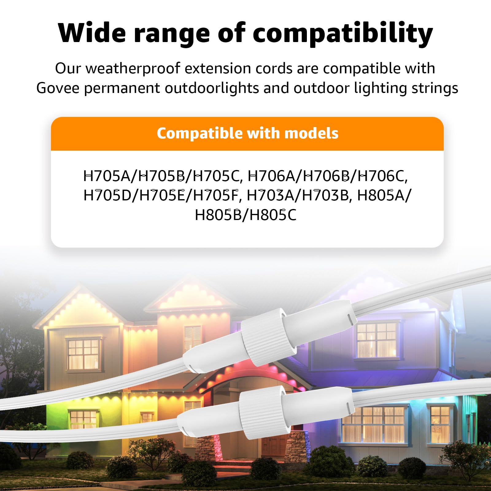 - Perfect Compatibility: Our 1 Male to 2 Female Y-shaped extension cable is compatible with Govee permanent outdoor lights, suitable for the H705A/H705B/H705C series,H805A/H805B/H805C series models. Note: The extension cable can only connect lights within the same series