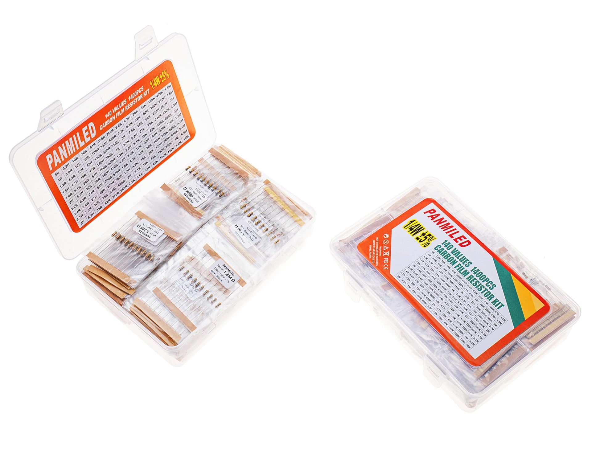 PANMILED 140 Values 1400 Pieces Resistors Assortment Kit 0 ohm-10M ohm, 1/4 watt 5% Carbon Film Resistor Combination Kit, Plug-in Resistor Element Packaging