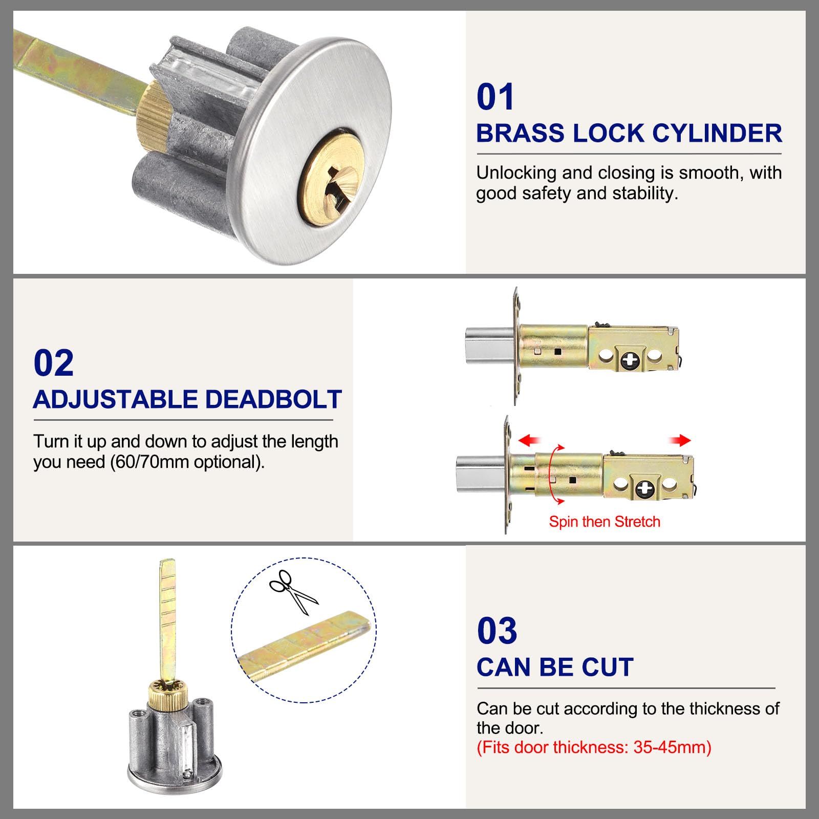 - EASY TO INSTALL - Our deadbolts are designed to fit most standard doors (right-handed and left-handed doors). Each lock set includes a deadbolt, latch, strike plate, 2pcs x M5*65 screws, 4pcs x self-tapping screws, and 3pcs x keys, you can quickly and easy to install the deadbolt.