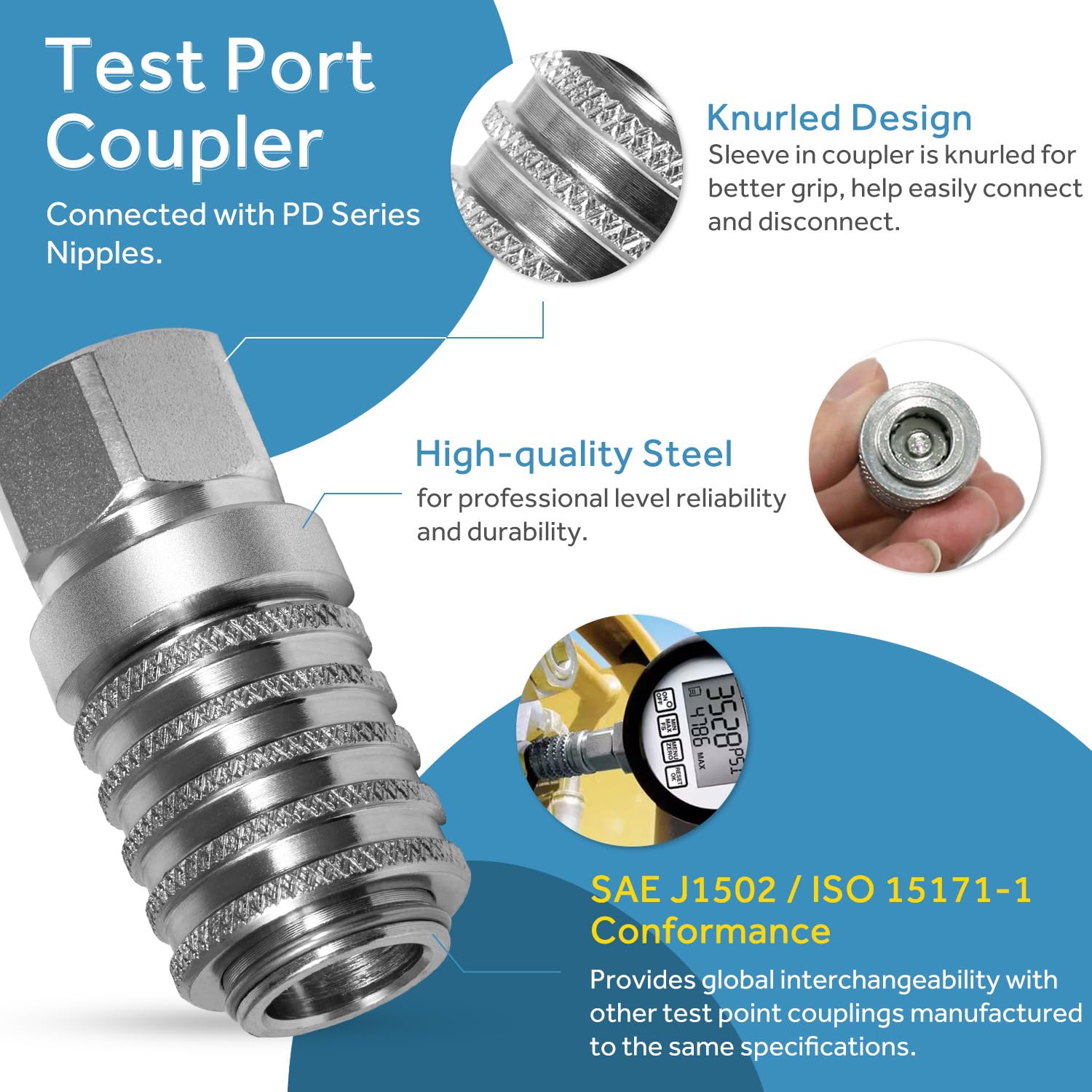 - High Quality: Made of high-quality steel for professional level reliability and durability, ensuring corrosion, rust and impact resistance. SAE J1502 / ISO 15171-1 conformance provides global interchangeability with other test point couplings manufactured to the same specifications.