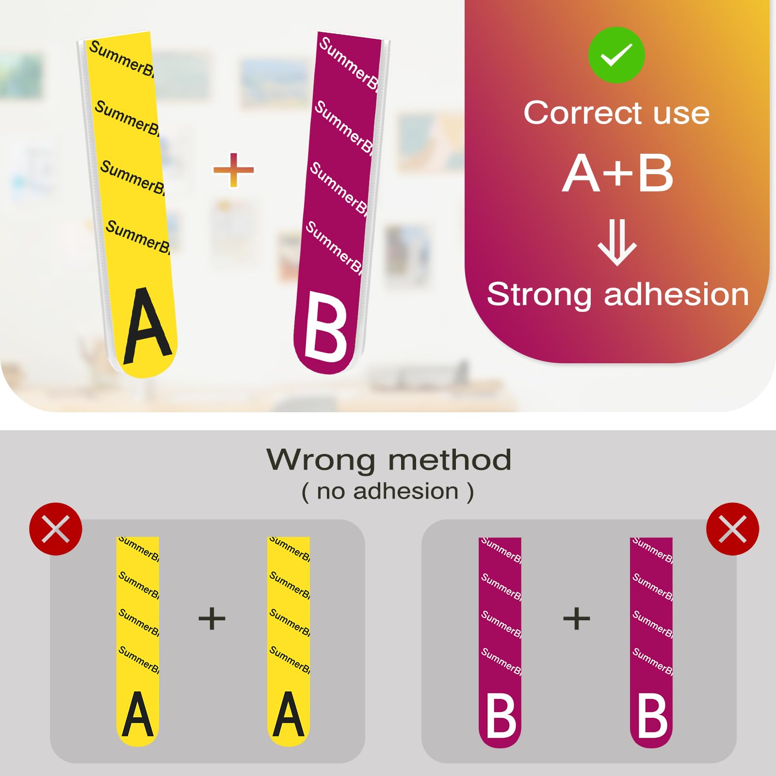 - Easy To Use: Simply clean and dry the surface before use. You can apply either the hook (A) or loop (B) side to your object—both options provide equally strong adhesion. Once attached, firmly press the strips onto a flat surface to activate the adhesive