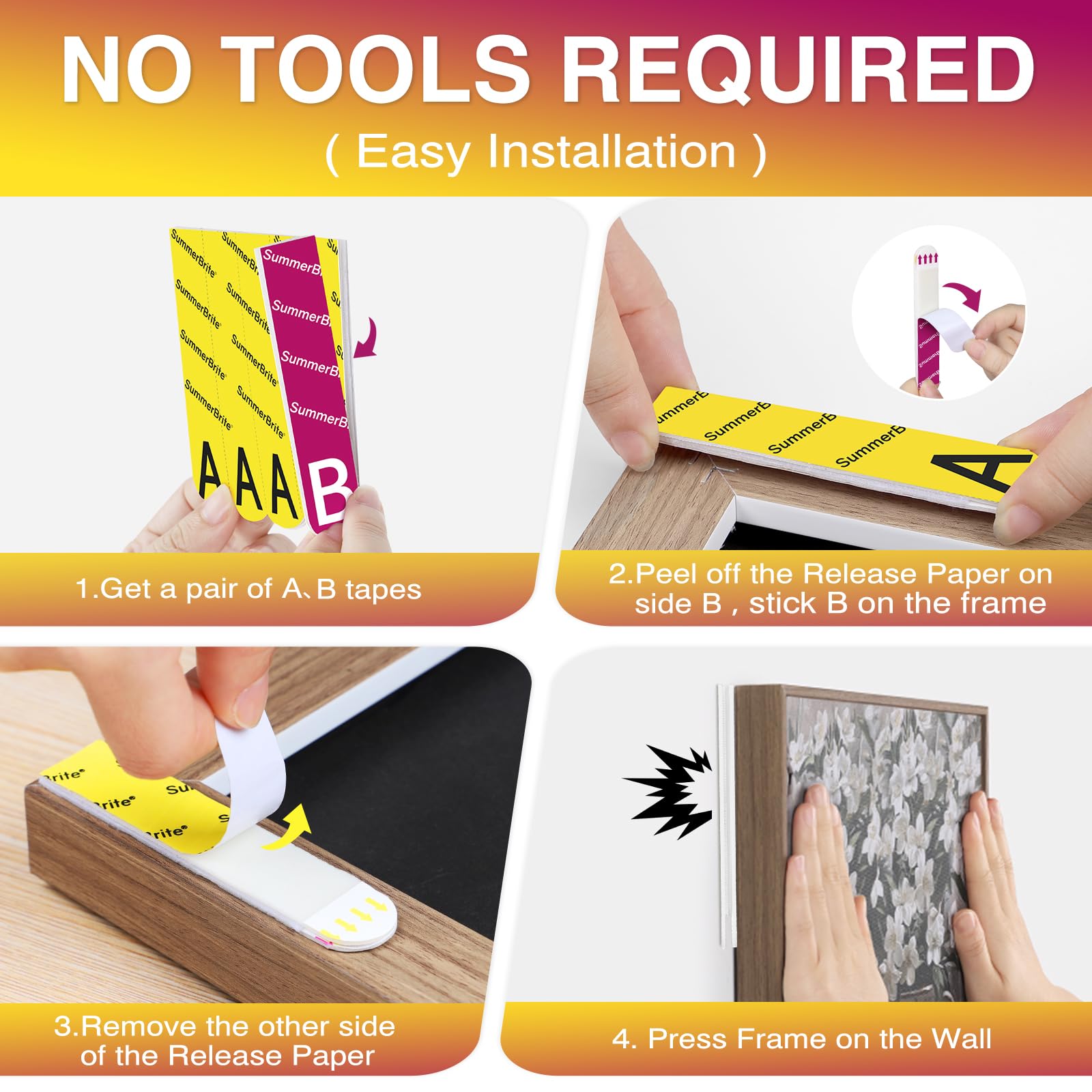 - A+B Hanging Adhesive Strips: Our Picture Hanging Strips (50 pairs/100 strips) provide a nail-free solution for hanging pictures, artwork, or DIY decorations. Featuring a hook-and-loop (A+B) combination, these strips are backed with high-quality adhesive for a strong, secure hold without the need for nails or liquid adhesives
