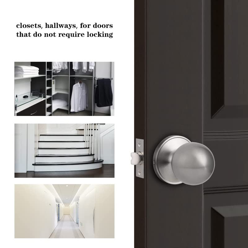 - APPLICATION: Round Brushed Nickel passage door knob for use on interior doors requiring no locking functionality, such as hallway, closet, pantry doors